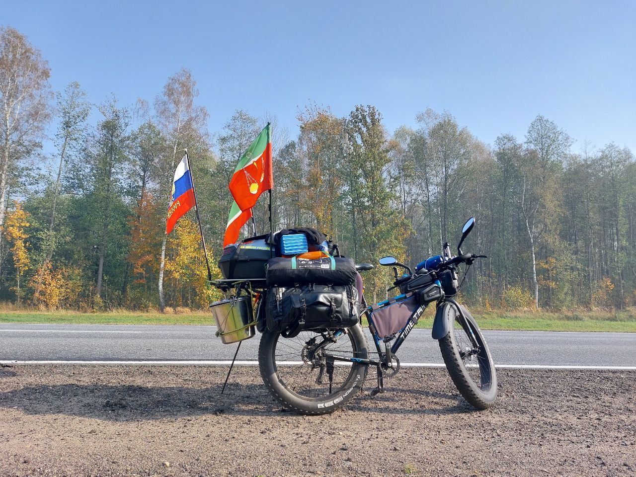 Сейчас Сергей ездит на фитбайке — «велосипед-тяжеловоз» на широких мощных колёсах, повышенной проходимости. На нём 40 килограммов груза: палатка, посуда, одежда на все сезоны, удочки и прочее для автономного выживания в лесу и на дорогах.
