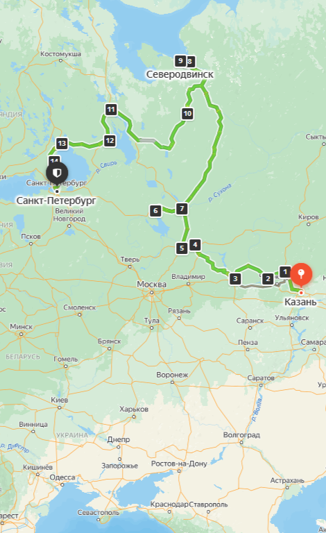 Казань → Йошкар-Ола → Нижний Новгород → Кострома → Ярославль → Череповец → Вологда → Архангельск → Северодвинск → посёлок Мирный, Архангельская область → Каргополь → Пудыш → Медвежьегорск → нацпарк Сортавала, Карелия → Медвежьегорск→ Петрозаводск → Приозёрск, Ленинградская область → Санкт-Петербург → Псков → Смоленск → Брянск → Орёл → Воронеж → Старый Оскол → Белгород.