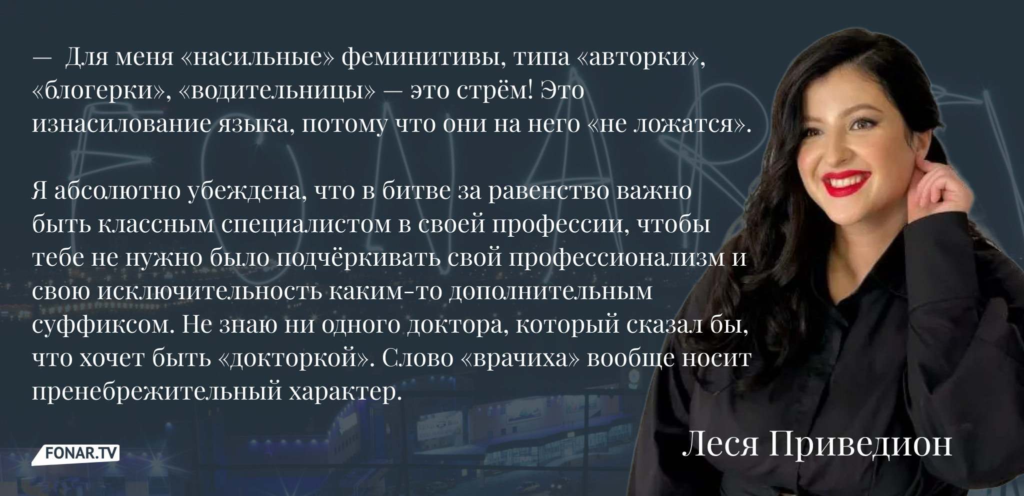 — Для меня «насильные» феминитивы, типа «авторки», «блогерки», «водительницы» — это стрём! Это изнасилование языка, потому что они на него «не ложатся».