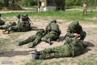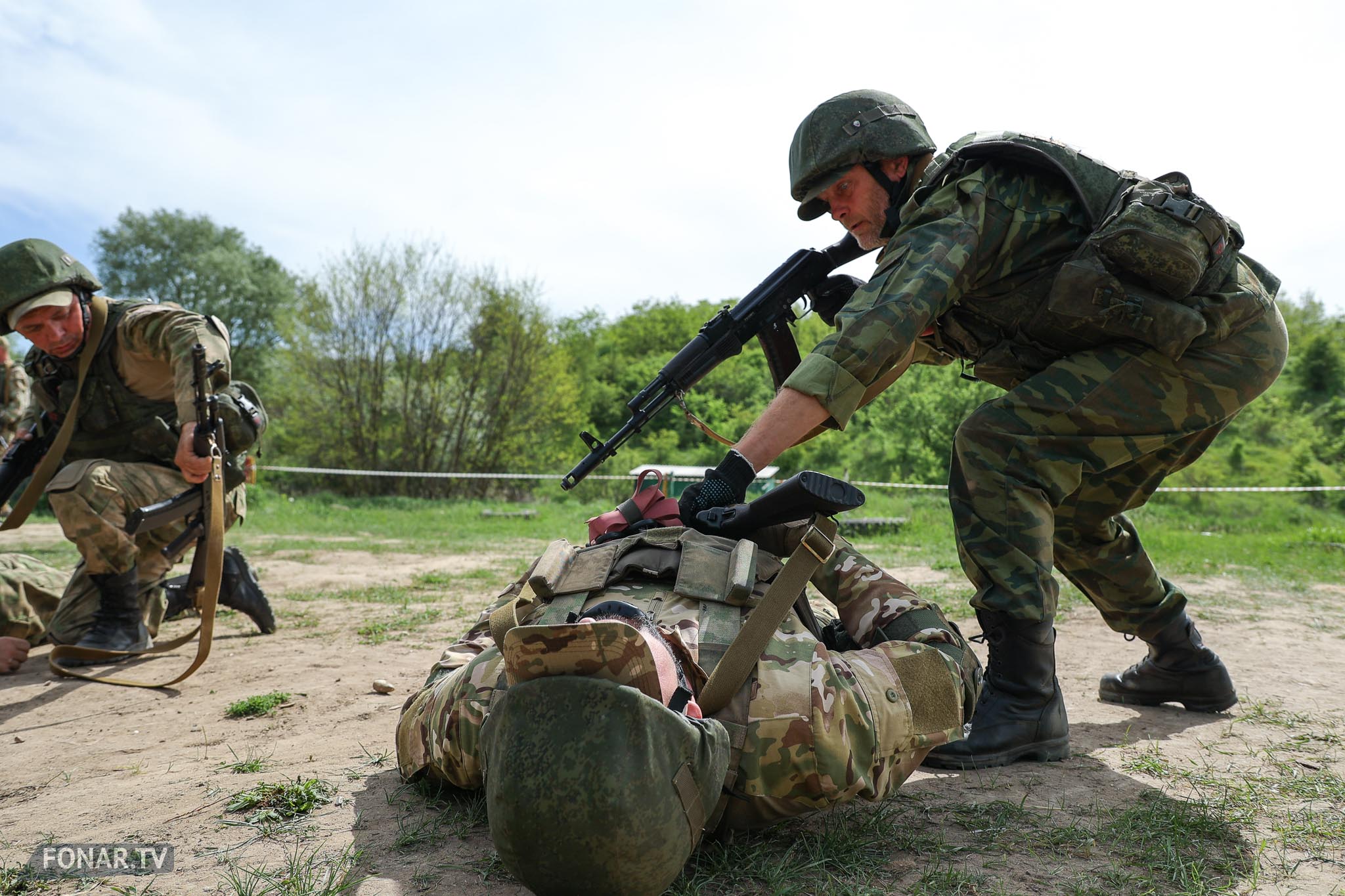 Неожиданно зрелищной оказалась отработка навыков первой помощи пострадавшим: бойцы поделились на две группы — «раненых» и «спасающих». «Раненые» по команде упали на землю, и к каждому из них поспешил напарник, громко заявляя о своих мирных намерениях:
