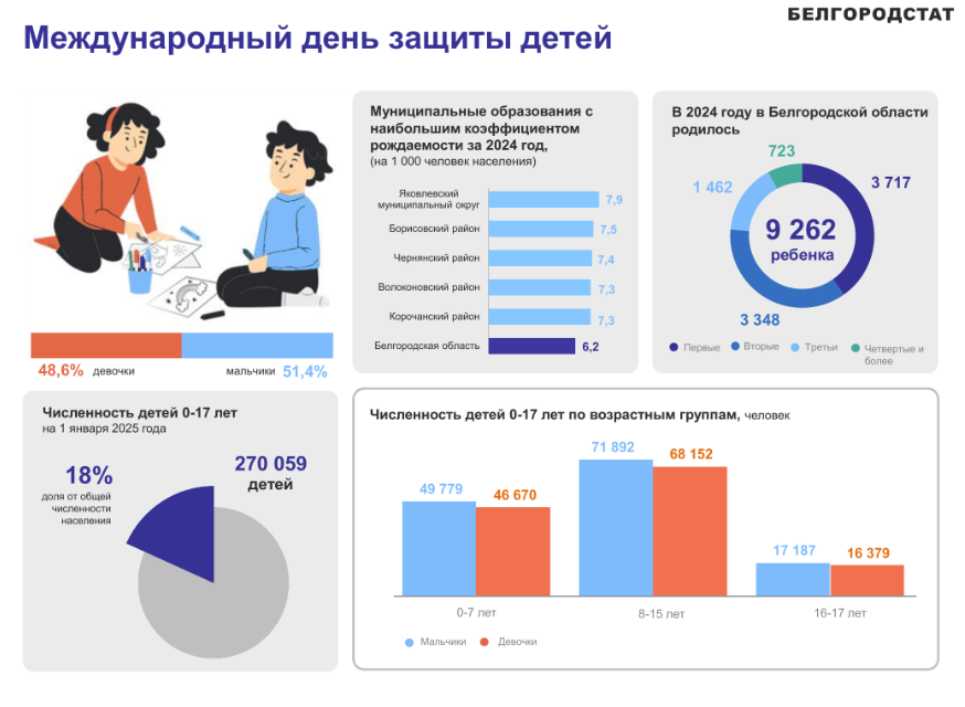 По данным на начало 2025 года, в Белгородской области проживает около 270 тысяч детей и подростков в возрасте до 17 лет — это почти каждый пятый житель региона. Мальчиков традиционно чуть больше: 51 против 49 процентов девочек. Самую большую возрастную группу — более половины от общего числа — составляют дети от восьми до 15 лет. Ещё треть — малыши до семи лет. Подростков 16–17 лет — 12 процентов.
