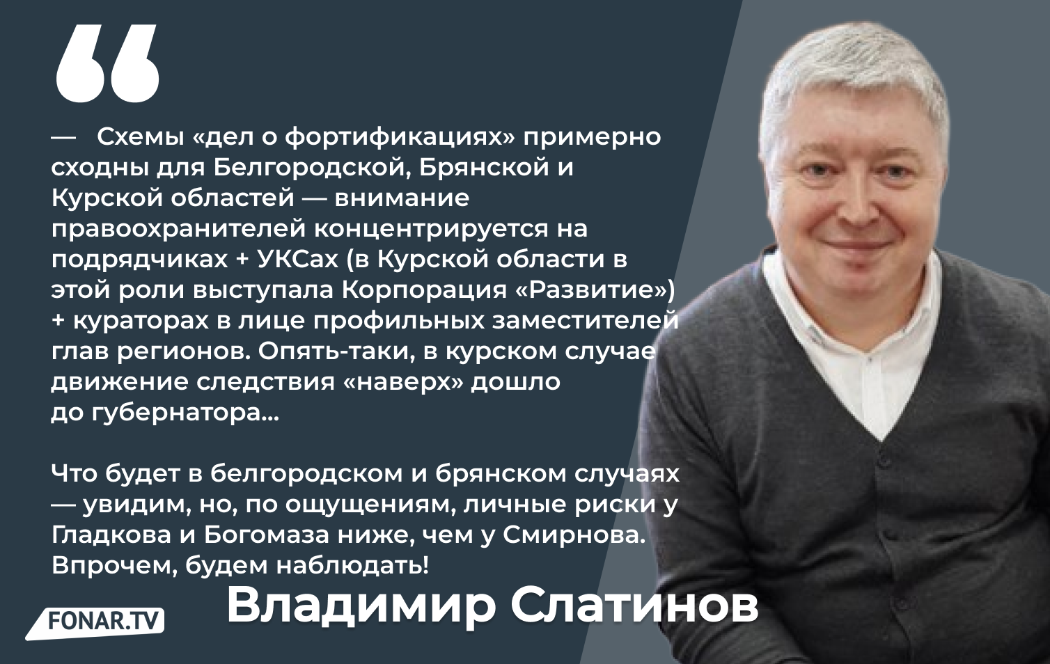 — Схемы «дел о фортификациях» примерно сходны для Белгородской, Брянской и Курской областей — внимание правоохранителей концентрируется на подрядчиках + УКСах (в Курской области в этой роли выступала Корпорация «Развитие») + кураторах в лице профильных заместителей глав регионов. Опять-таки, в курском случае движение следствия «наверх» дошло до губернатора (который первоначально был председателем правительства и первым заместителем главы региона). Что будет в белгородском и брянском случаях — увидим, но, по ощущениям, личные риски у Гладкова и Богомаза ниже, чем у Смирнова. Впрочем, будем наблюдать! — написал в своём канале политолог.