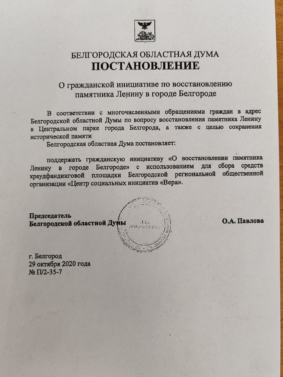 Копия постановления облдумы, с которого и начался краудфандинг