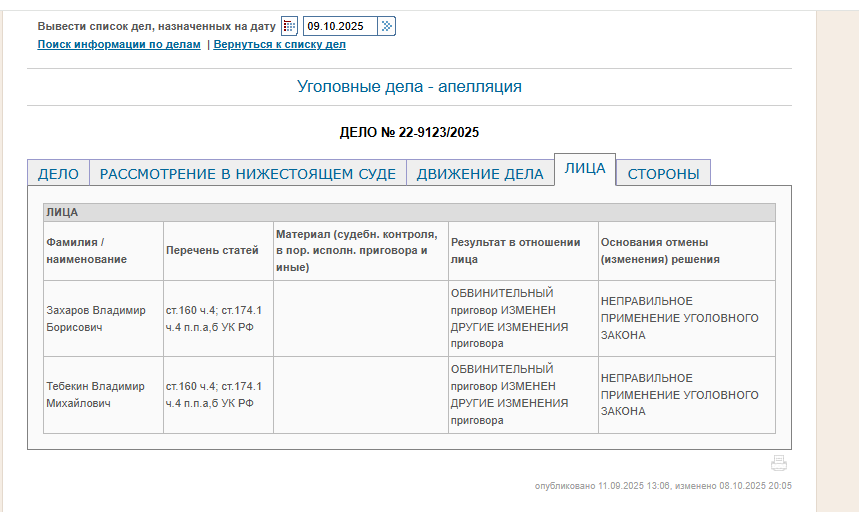 «Доказательства стороны обвинения получили надлежащую оценку. Существенных нарушений нет. Прошу оставить приговор без изменения, апелляционные жалобы — без удовлетворения. Освободить Тебекина и Захарова от наказания в связи с истечением сроков давности».