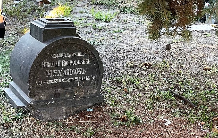 Первое надгробие, встретившееся нам на пути, — памятник землевладельцу Николаю Евграфовичу Муханову, владевшему землями от территорий современного села Грязное и до нынешнего посёлка Октябрьского. Николай Евграфович выращивал зерновые культуры для производства муки и для кормов для лошадей. В дореволюционное время лошади служили не только транспортным средством, но и двигателем сельского хозяйства, и корма для них были необходимы. Дело Муханова процветало.