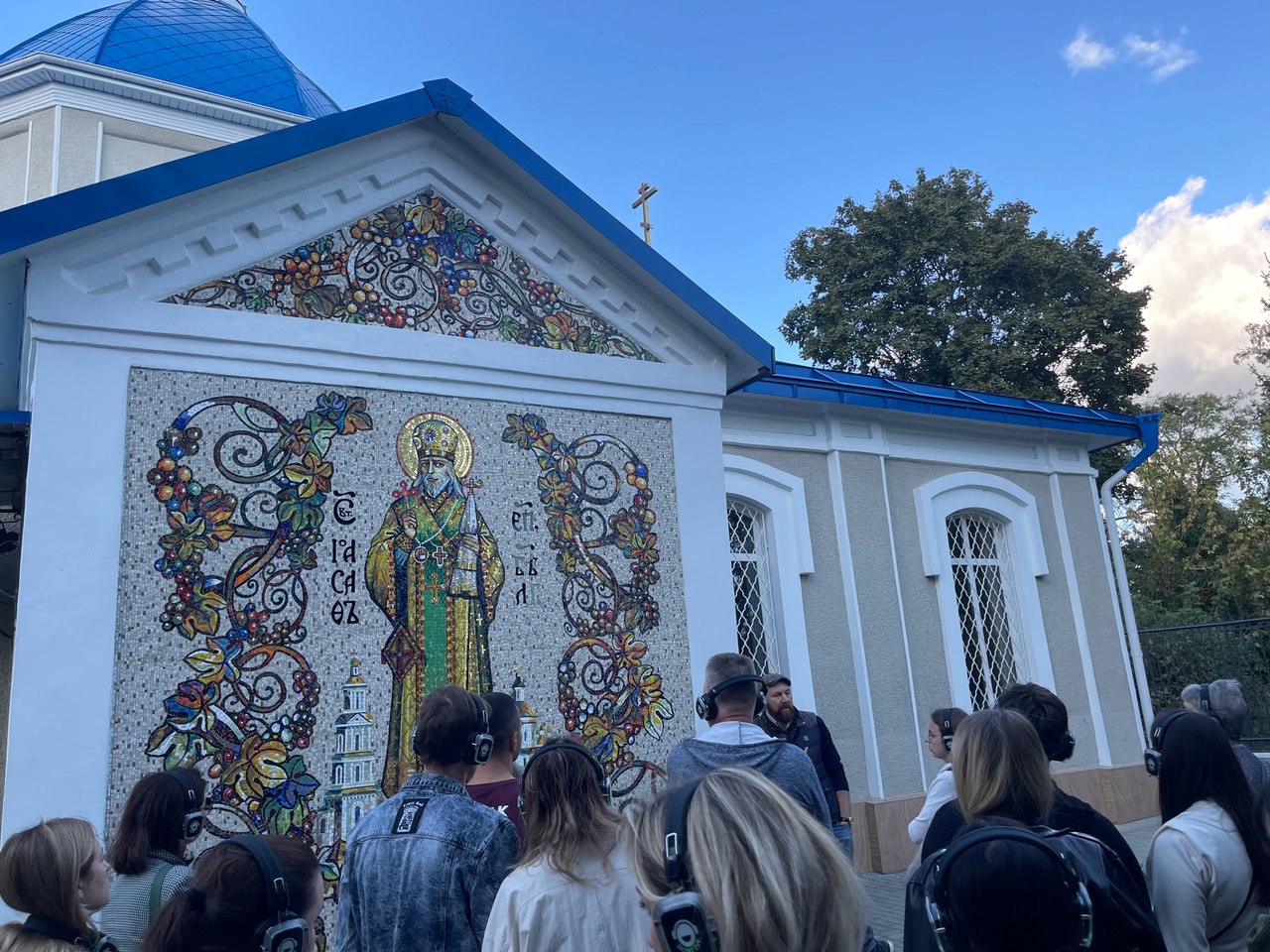Выйдя на центральную аллею кладбища, поднимаемся вверх к собору. Его стены украшены яркой мозаикой, игриво сверкающей на солнце. На ней изображён Иоасаф Белгородский. Наш местный святой — выходец из богатой семьи из города Прилуки Черниговской области. Дядя Иоасафа был монахом Киево-Печерской лавры. Во время своего обучения в Киеве, Иоасаф тайно постригся в монахи и получил монастырь в Полтавской губернии.