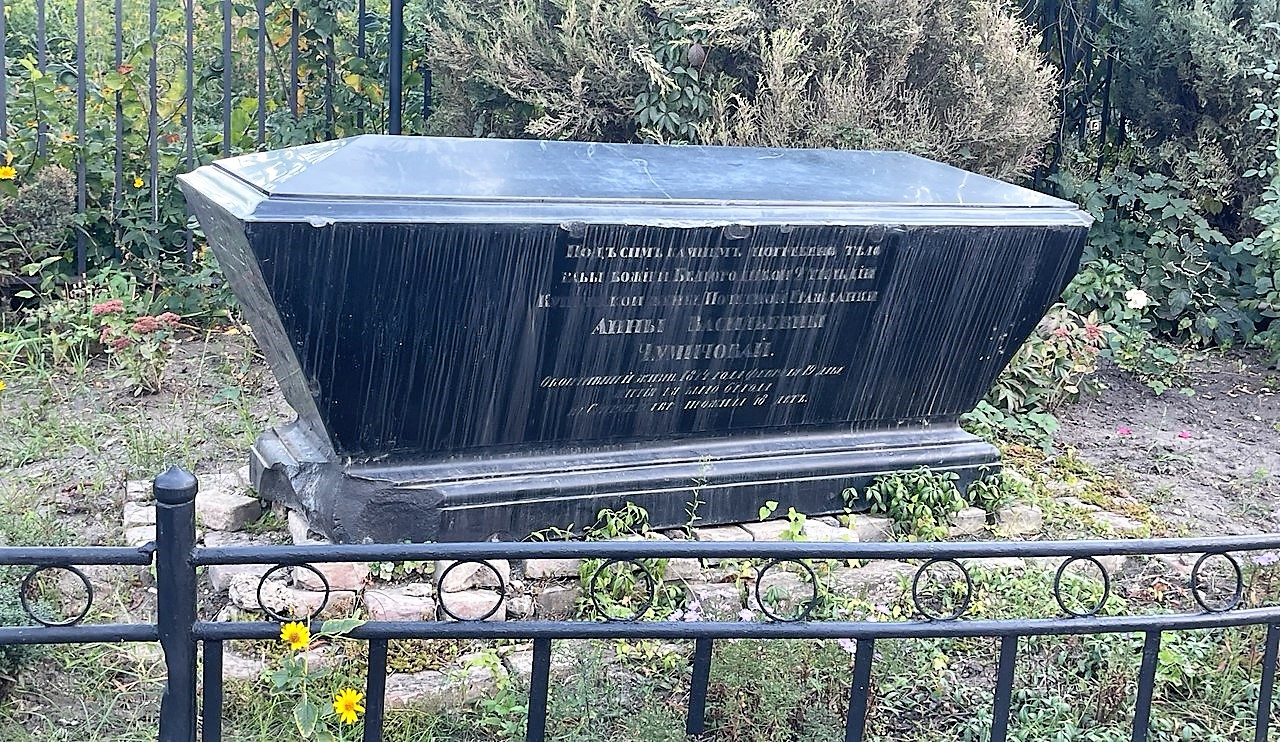 Слева от собора видим огромный чёрный каменный гроб. Это памятник на могиле Анны Васильевны Чумичовой. До революции Чумичовы были одной из богатейших семей Белгорода, владевшей половиной предприятий города. Соперничать им приходилось с другим белгородским кланом — Манчуриных, которые главенствовали в другой половине города.