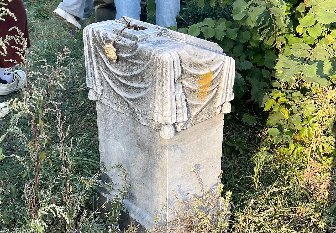 Переходим дорогу и оказываемся у южных ворот кладбища. Предупреждая наши вопросы о необычном расположении памятников, Алексей отмечает: не стоит удивляться тому, что они лежат хаотично. Дело в том, что кладбище, как и сам город, много раз перестраивалось. В разные периоды с места на место переносили дореволюционные памятники, камни двигали ближе к центральной аллее.