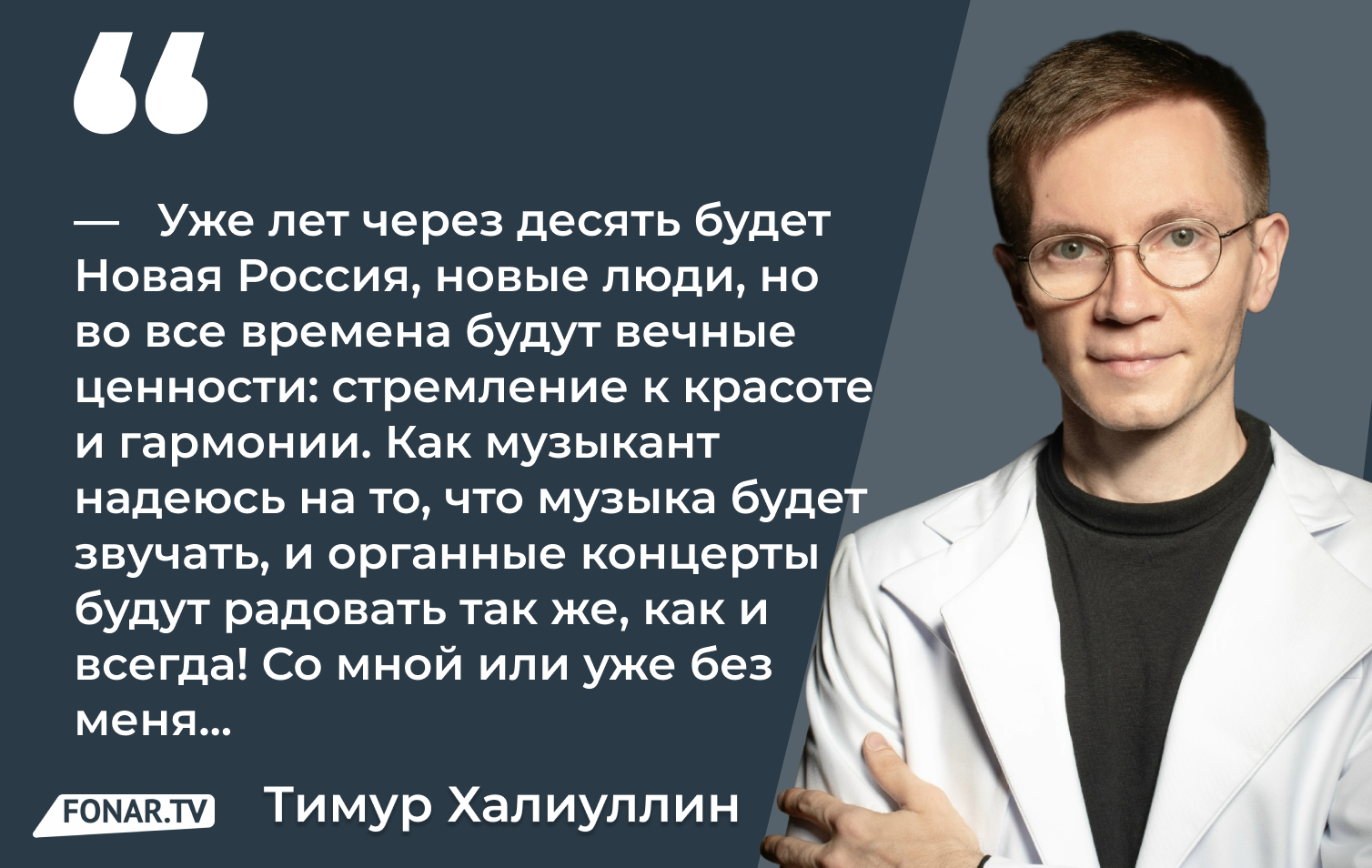 Что бы ни происходило — всё во благо! Но пусть в будущем времени не будет войны и пусть людям будет так стыдно за прошлое, как только это может быть, чтобы долго ещё не допускать таких ошибок! Уже лет через десять будет Новая Россия, новые люди, но во все времена будут вечные ценности: стремление к красоте и гармонии. Как музыкант надеюсь на то, что музыка будет звучать, и органные концерты будут радовать так же, как и всегда! Со мной или уже без меня... Главное пожелание к себе в будущем: так же любить своё настоящее, как его я люблю сейчас, любить жизнь вне времени и несмотря ни на что!