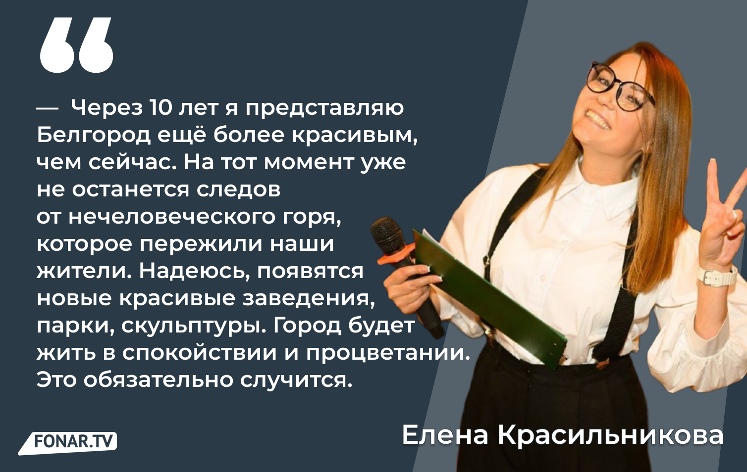 Через 10 лет я представляю Белгород ещё более красивым, чем сейчас. На тот момент уже не останется следов от нечеловеческого горя, которое пережили наши жители. Надеюсь, появятся новые красивые заведения, парки, скульптуры. Город будет жить в спокойствии и процветании. Это обязательно случится.
