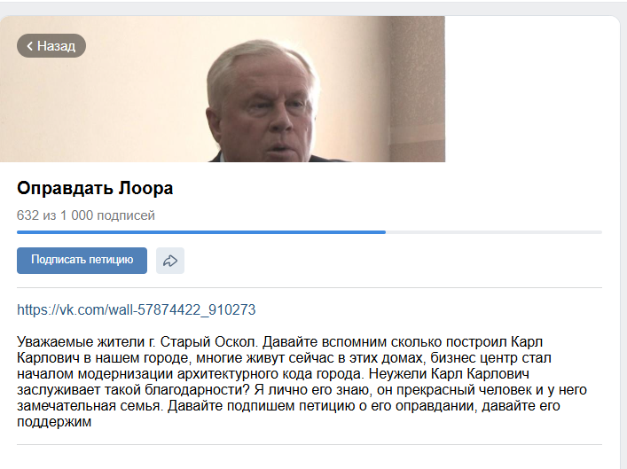 Во «ВКонтакте» появилась петиция в поддержку старооскольского бизнесмена Карла Лоора, об уголовных делах на которого «Фонарь» рассказал на прошлой неделе. Её автором стала пользовательница «Оранжевая Белка». К моменту выхода нашей публикации её подписали уже 632 человека.