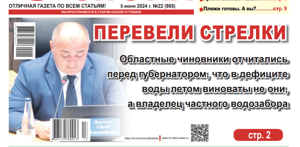 Первая полоса «Новостей Оскола» с анонсом статьи о Тереховском водозаборе, июнь 2024 года