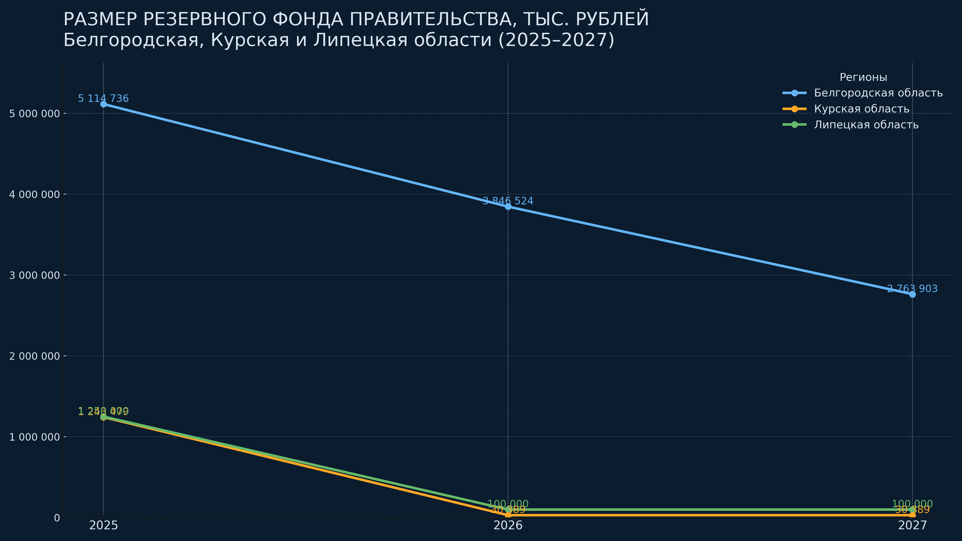 У Курской области начальная сумма значительно ниже, чем у Белгородской области, и она резко сокращается к 2026 году примерно на 97,5 процента, сохраняя незначительный уровень вплоть до 2027 года. В Липецкой области уровень резервного фонда остаётся стабильным, демонстрируя значительное сокращение с начала периода до конца лишь в рамках сокращения общего объёма финансирования региона.