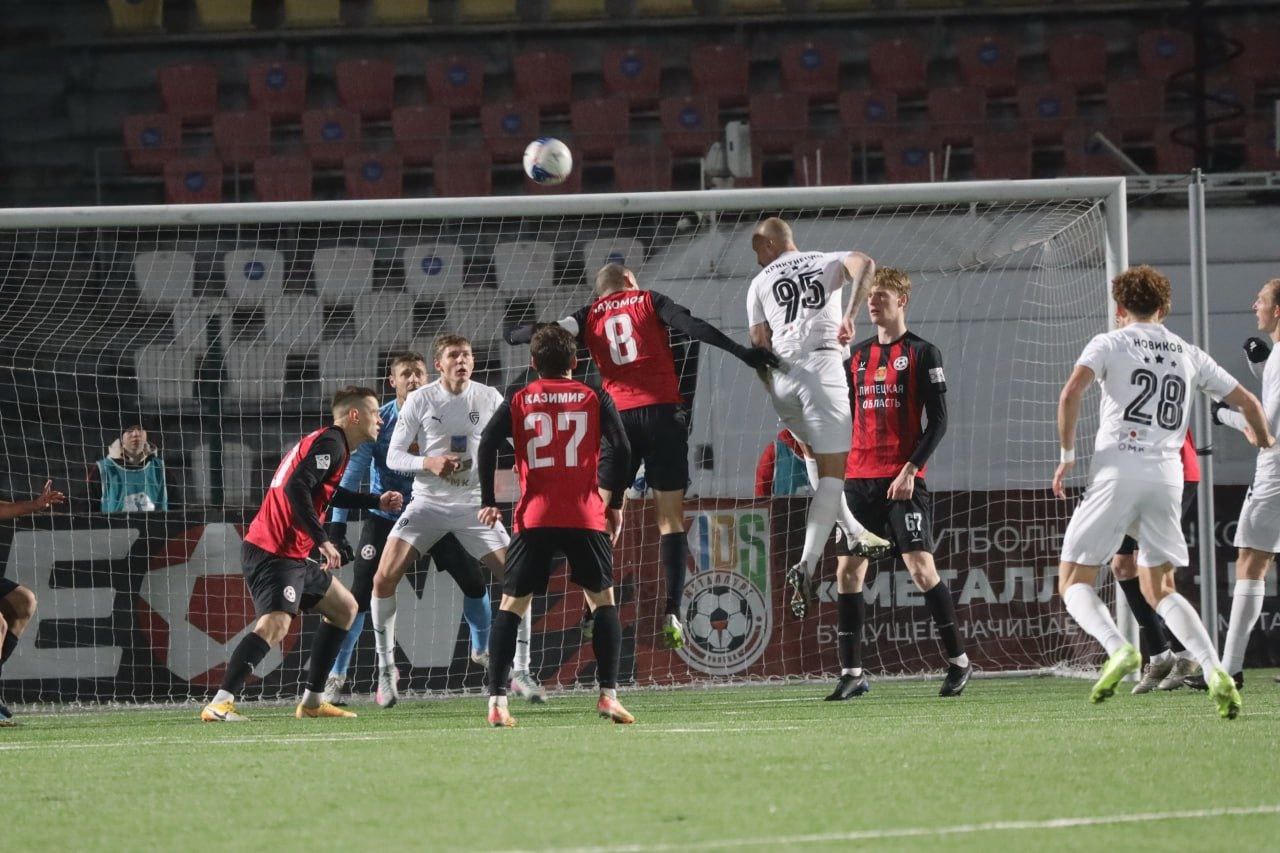 Первый подход к чужим воротам «красно-чёрные» сумели организовать в следующей же атаке. Отобрав мяч на чужой половине поля, на удар вывели Матвея Елизарова. Но этот самый удар получился не опасным, и Владислав Зернаев без труда поймал мяч в свои руки.