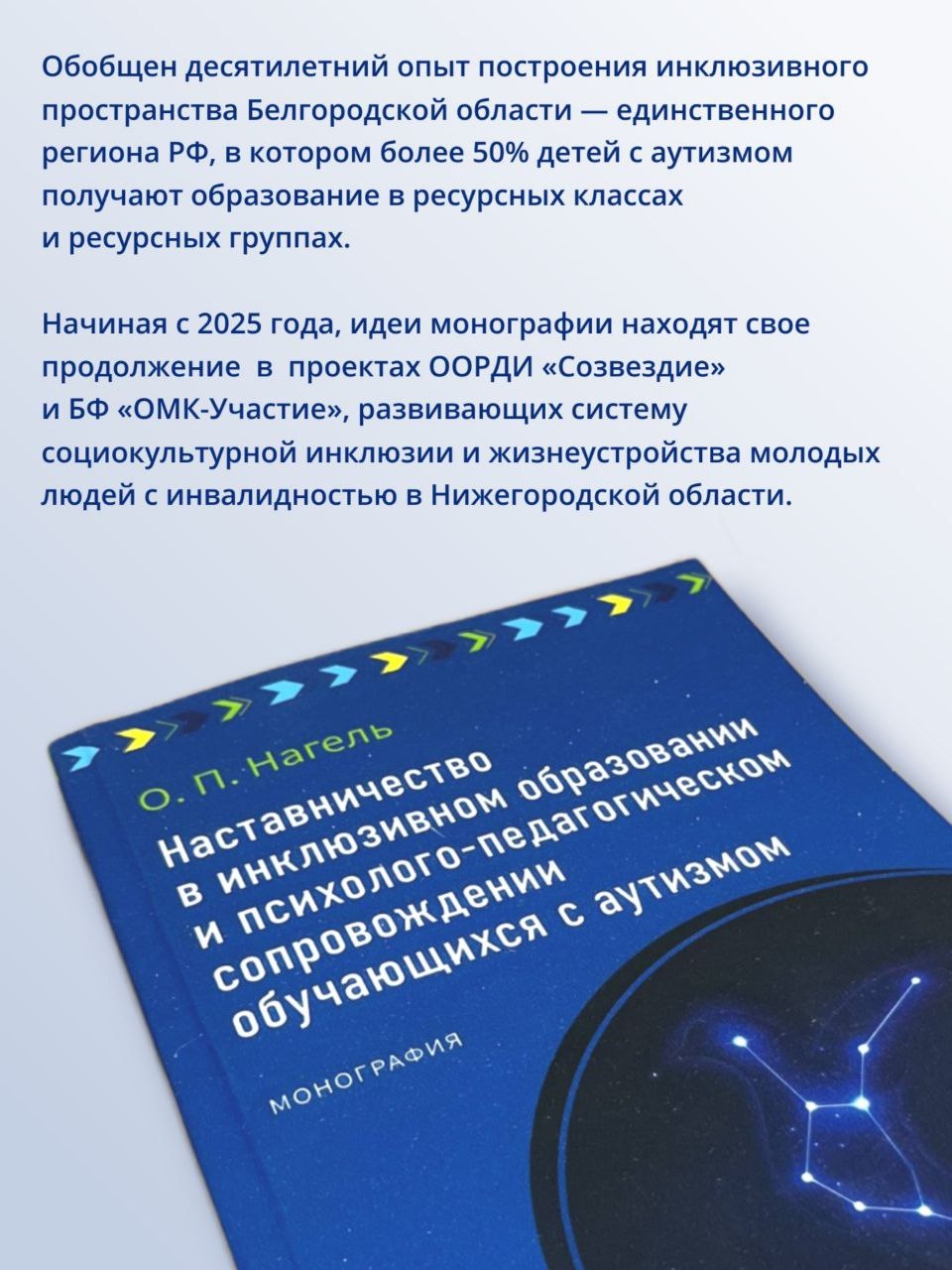 Стратегия, которая затрагивает все уровни образования и специальной помощи: министерство [образования], Институт развития образования, ресурсный центр для детей с РАС, уровень муниципалитетов и отдельных организаций. Для меня монография — подготовительная работа к защите докторской диссертации. Сейчас я увлечена новыми идеями, новыми фантастическими специалистами Нижегородской области, где работаю с нынешнего года. Меня пригласили туда для крупного проекта в сфере инклюзии и трудоустройства молодых людей с инвалидностью.