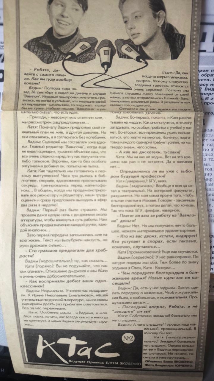Интервью Вадима Рязанцева о своей первой передаче «Музыкальный круиз» на радио «Вавилон», которую он вёл в 11-м классе. Газета «Смена», 1998 год.