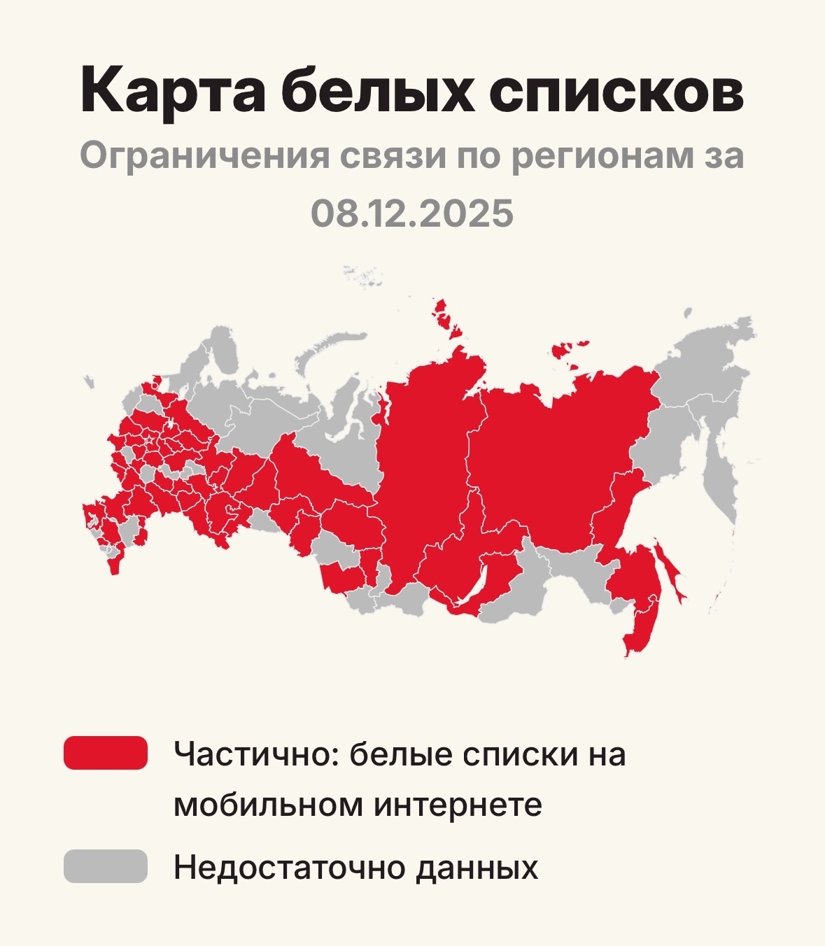 По данным проекта «На связи», в мае 2025 года зафиксировали 69 случаев отключения мобильного интернета. В июне это число увеличилось до 655. Согласно статистике сайта, примерно на 80 процентов территории России мобильный интернет хотя бы временно исчезал.