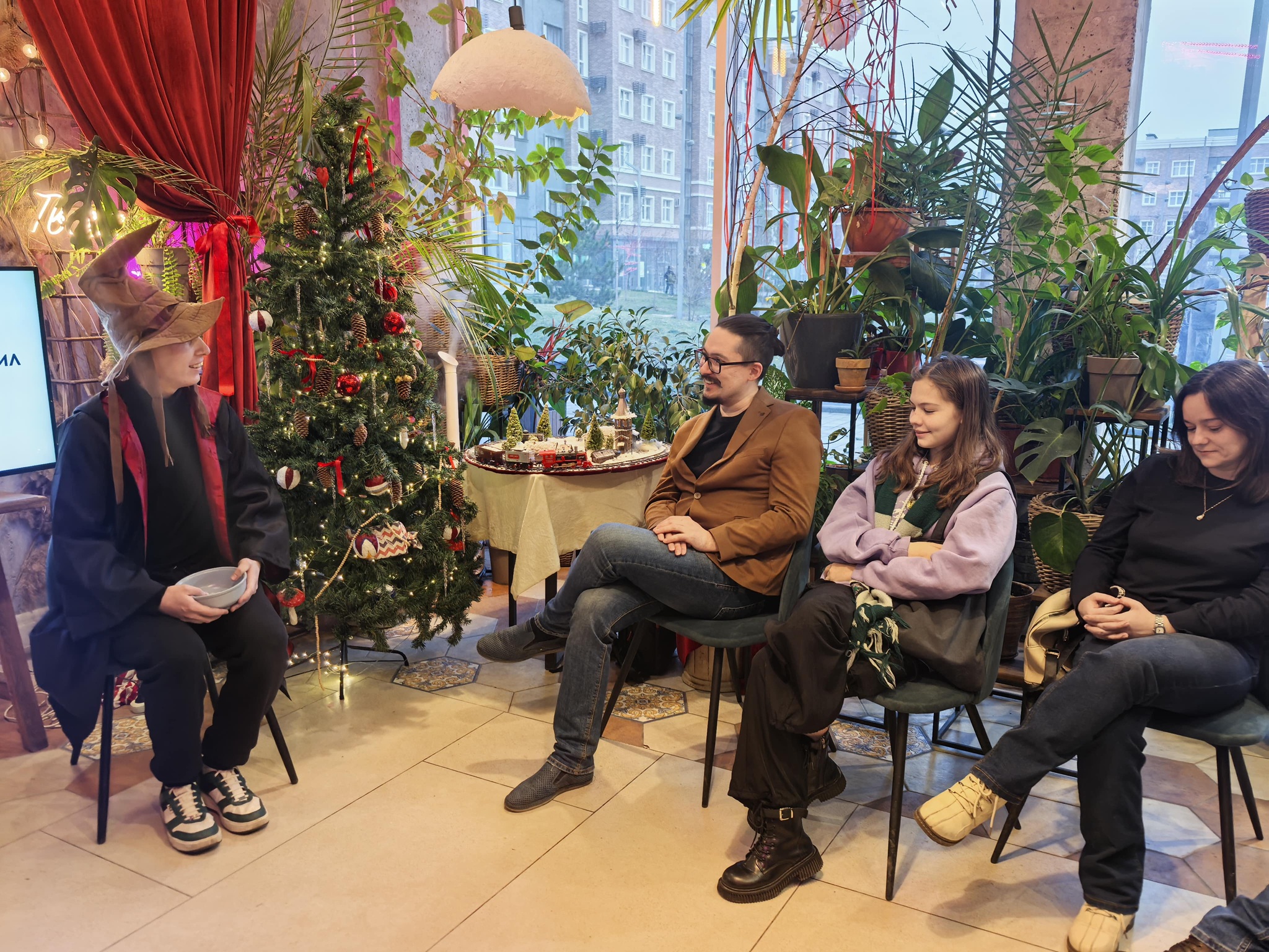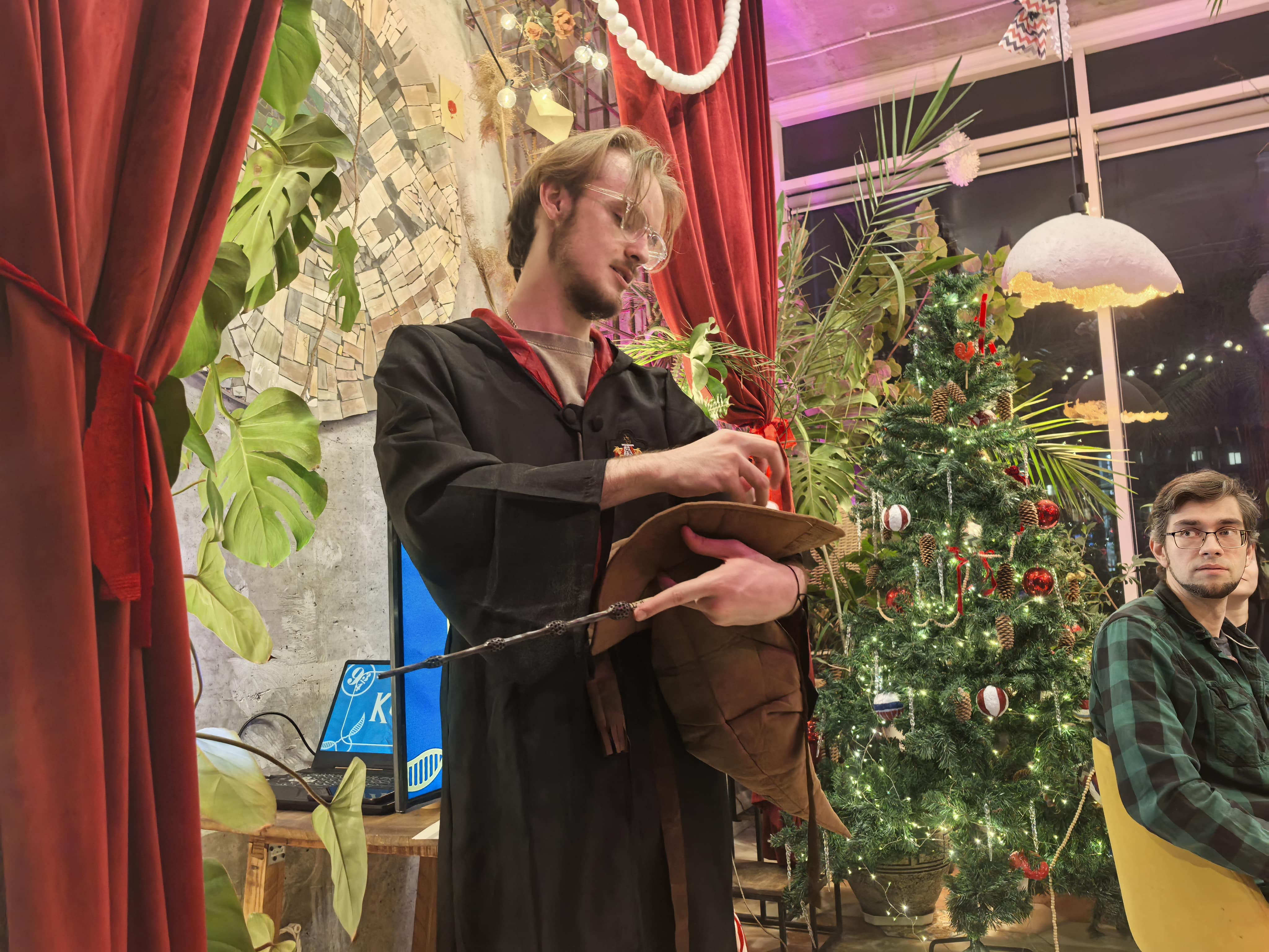 В кругу было 15 человек: собрались как взрослые, так и дети. К ним вышел один из организаторов — одетый в мантию молодой парень. В одной его руке была шляпа, а в другой палочка. Он познакомил зрителей друг с другом необычным способом — спросил, какой факультет Хогвартса они окончили.