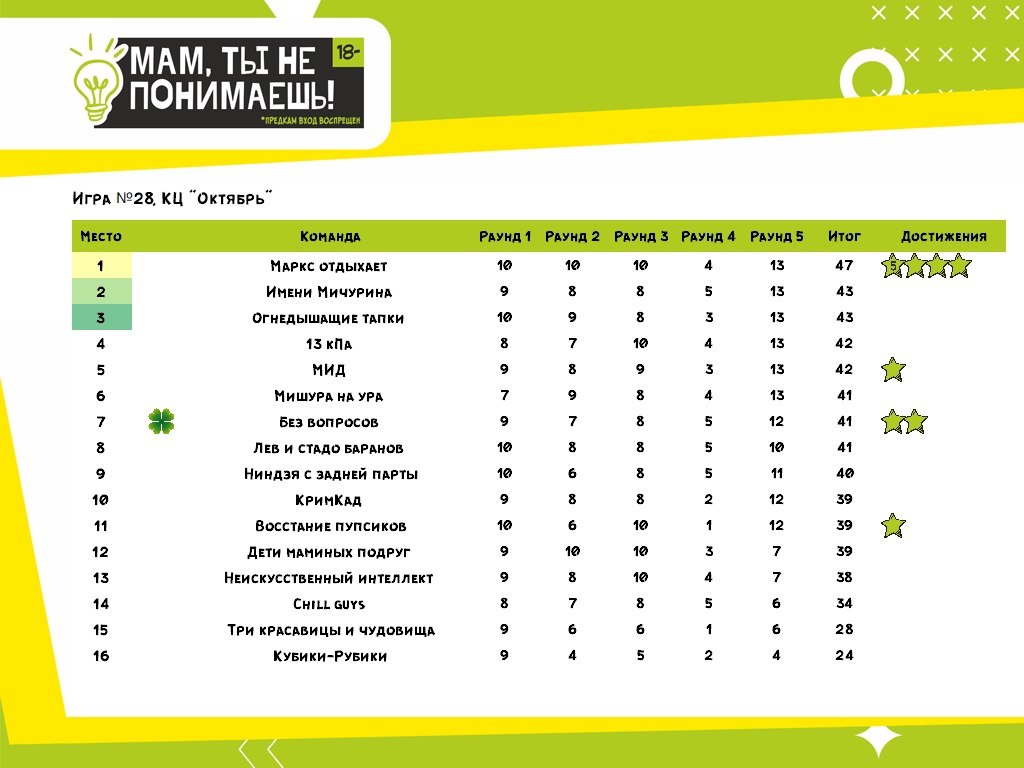 В итоге на 26-й игре второе и третье места разделили Chill Guys и «Маркс отдыхает», заработавшие по 44 балла. Первым стало «Министерство интересных детей» («МИД») с 52 баллами.