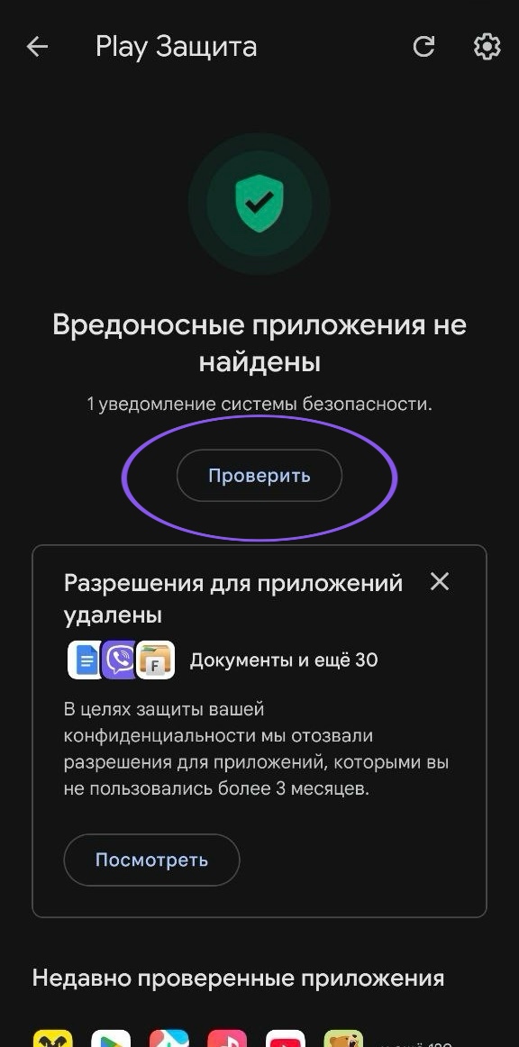 На Android главный страж встроен прямо в магазин приложений. Это Google Play Защита. Она работает по умолчанию, и её лучше никогда не отключать.