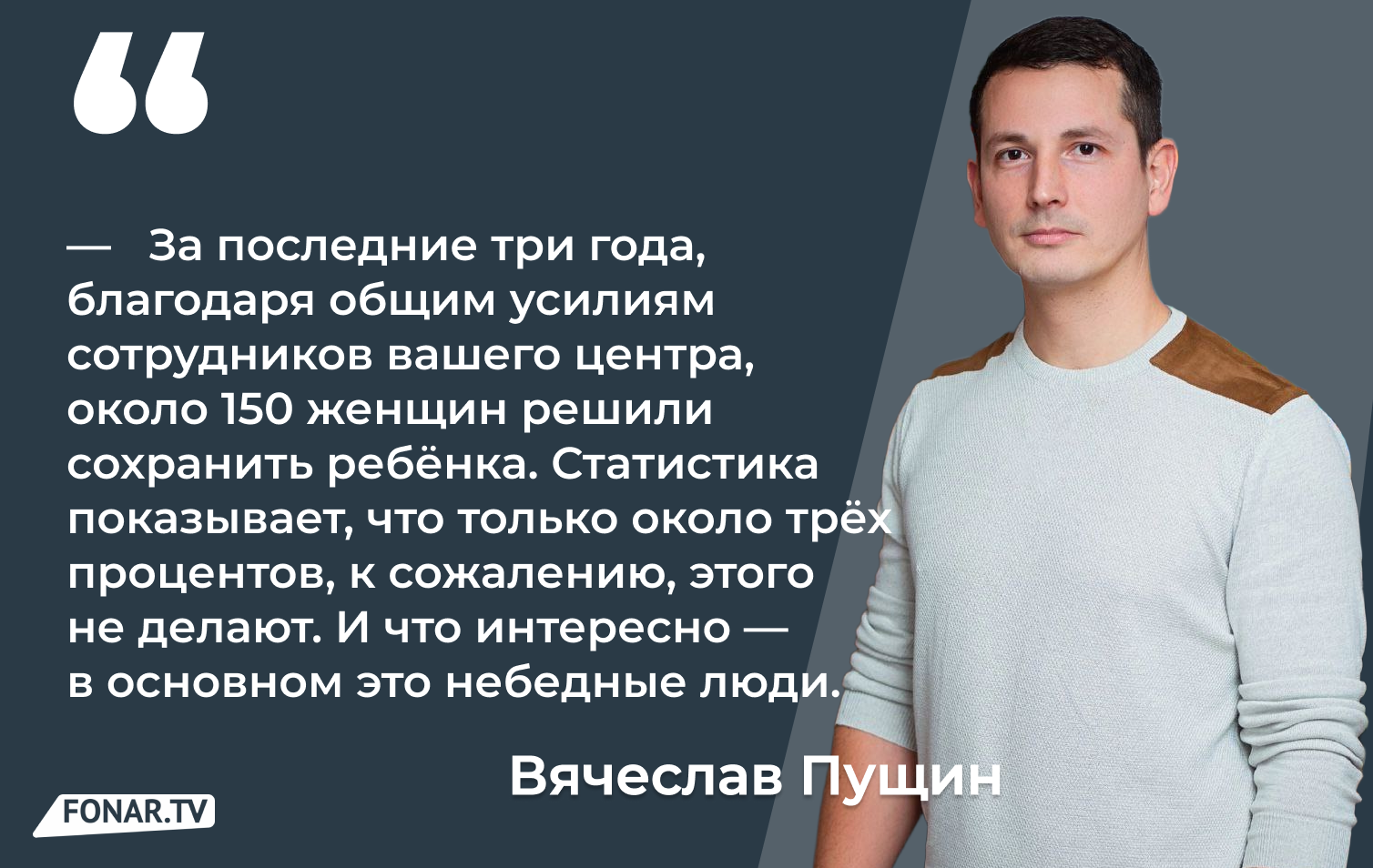В регионе с декабря 2022 года работает центр помощи беременным женщинам «Сохрани мне жизнь». Мы решили разобраться, как он работает, поэтому обратились к его руководителю Вячеславу Пущину — предпринимателю, который раньше занимался розничной торговлей мебелью и товарами для дома, владел компаниями «Белпаллет» и «Паллетгруп», а сейчас — возглавляет АНО, помогающее беременным, и занимается торговлей в фирме «Полиснаб», где, похоже, является единственным сотрудником (вся информация с сайта rusprofile.ru — прим. Ф.).