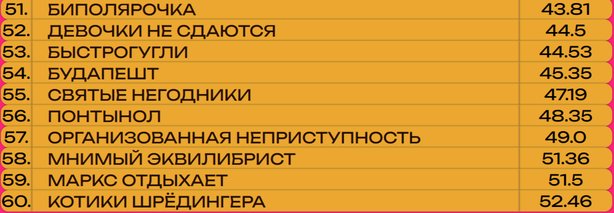 По итогам 59-й игры сильнейшими в очередной раз стала команда «Фонарь» — 73 очка в командном багаже. Два балла победителям уступил коллектив «Имени меня». Столько же очков набрала команда «Т9», ставшая третьей. В итоге она уже второй раз подряд зарабатывает бронзу.