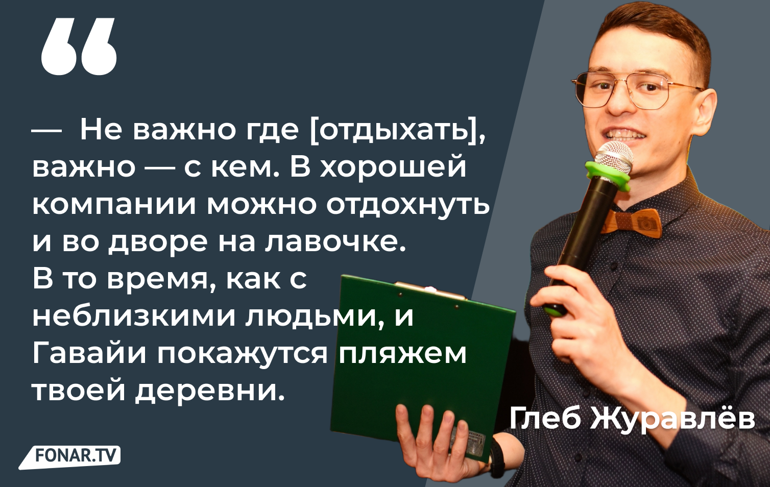 — В целом, я всегда верил в то, что не важно где [отдыхать], важно — с кем. В хорошей компании можно отдохнуть и во дворе на лавочке. В то время, как с неблизкими людьми, и Гавайи покажутся пляжем твоей деревни (смеётся).