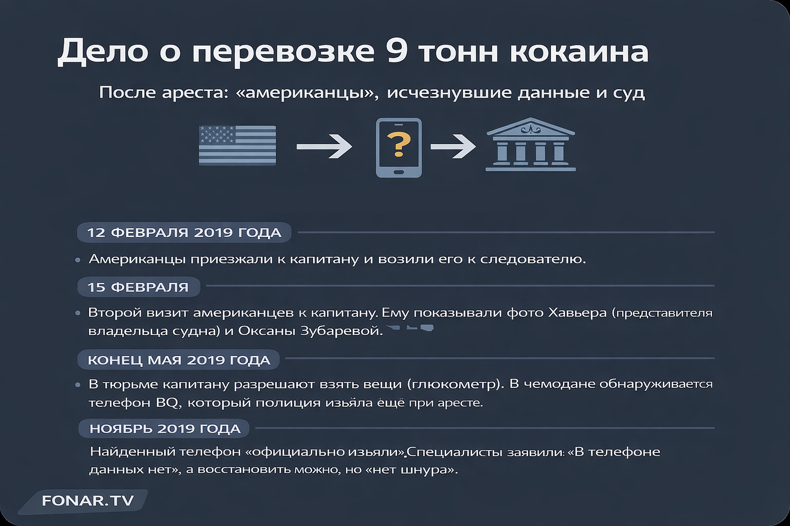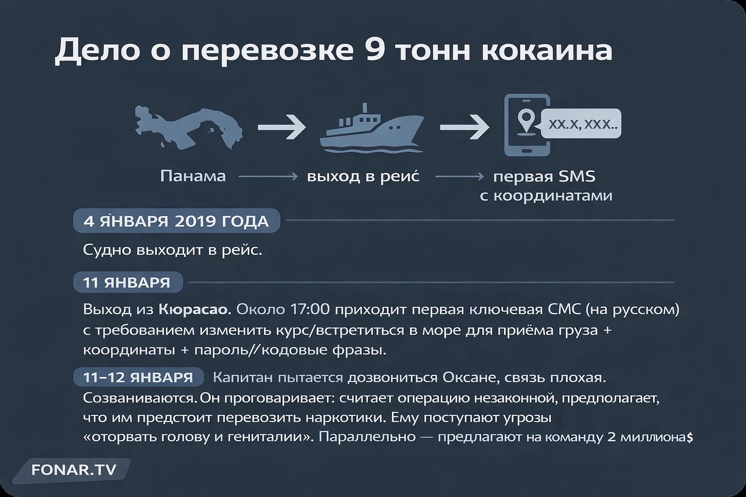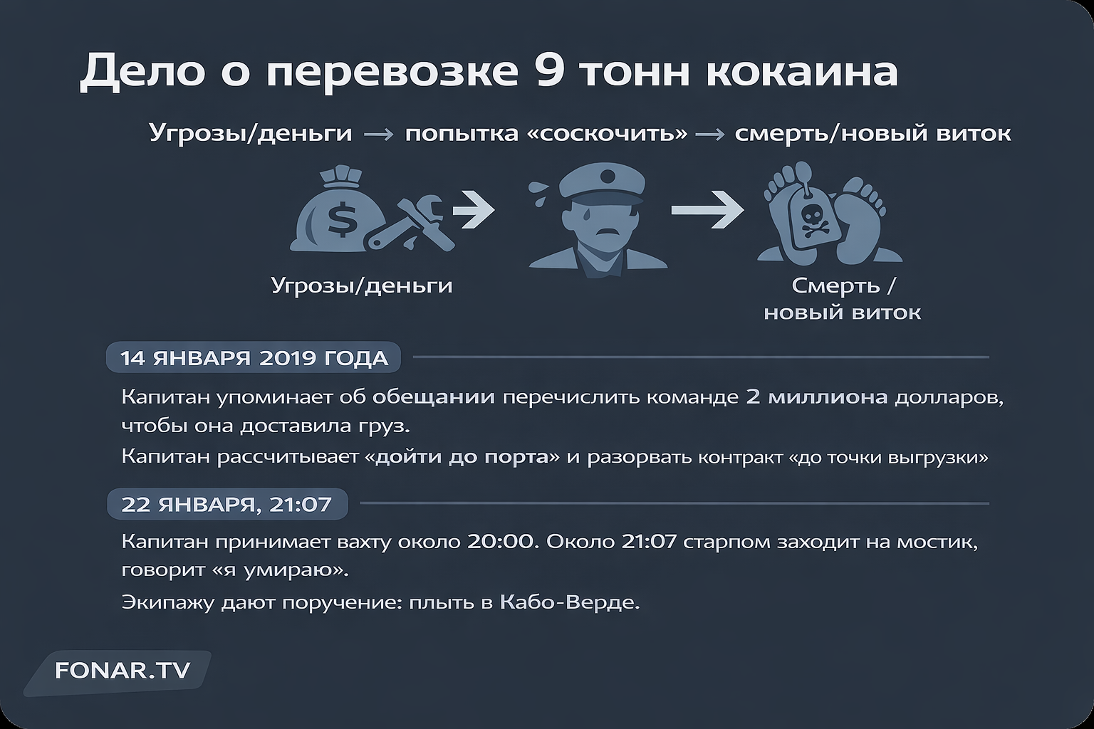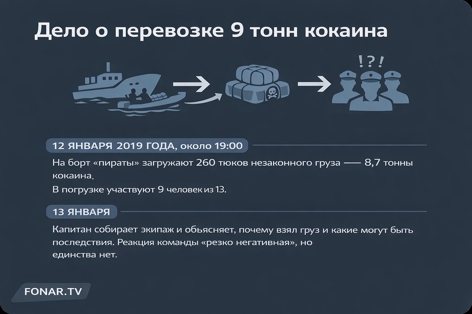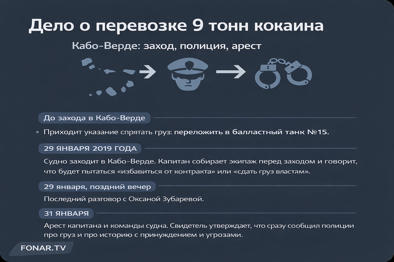 Если вы вдруг потерялись в версии событий, изложенной капитаном, мы сделали для вас карточки с хронологией произошедшего, опираясь на его показания.
