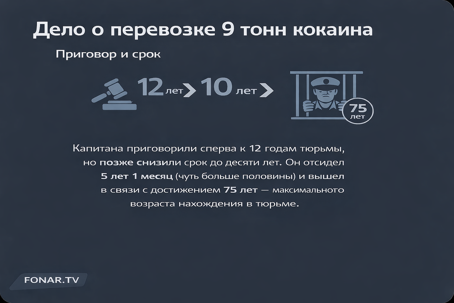 Суд уточняет: что это был за груз и по какой логике в дальнейшем команду осудили? Капитан говорит, что после изъятия груза в Кабо-Верде он узнал: это был кокаин, 260 тюков, и именно за «доставку кокаина» экипаж осудили. Формулировку уголовной статьи он точно не воспроизводит, но поясняет: осудили по «более мягкому варианту» как за транспортировку наркотиков, а не за участие в преступном сообществе. Приговор, по его словам, вынесли на пятый день.