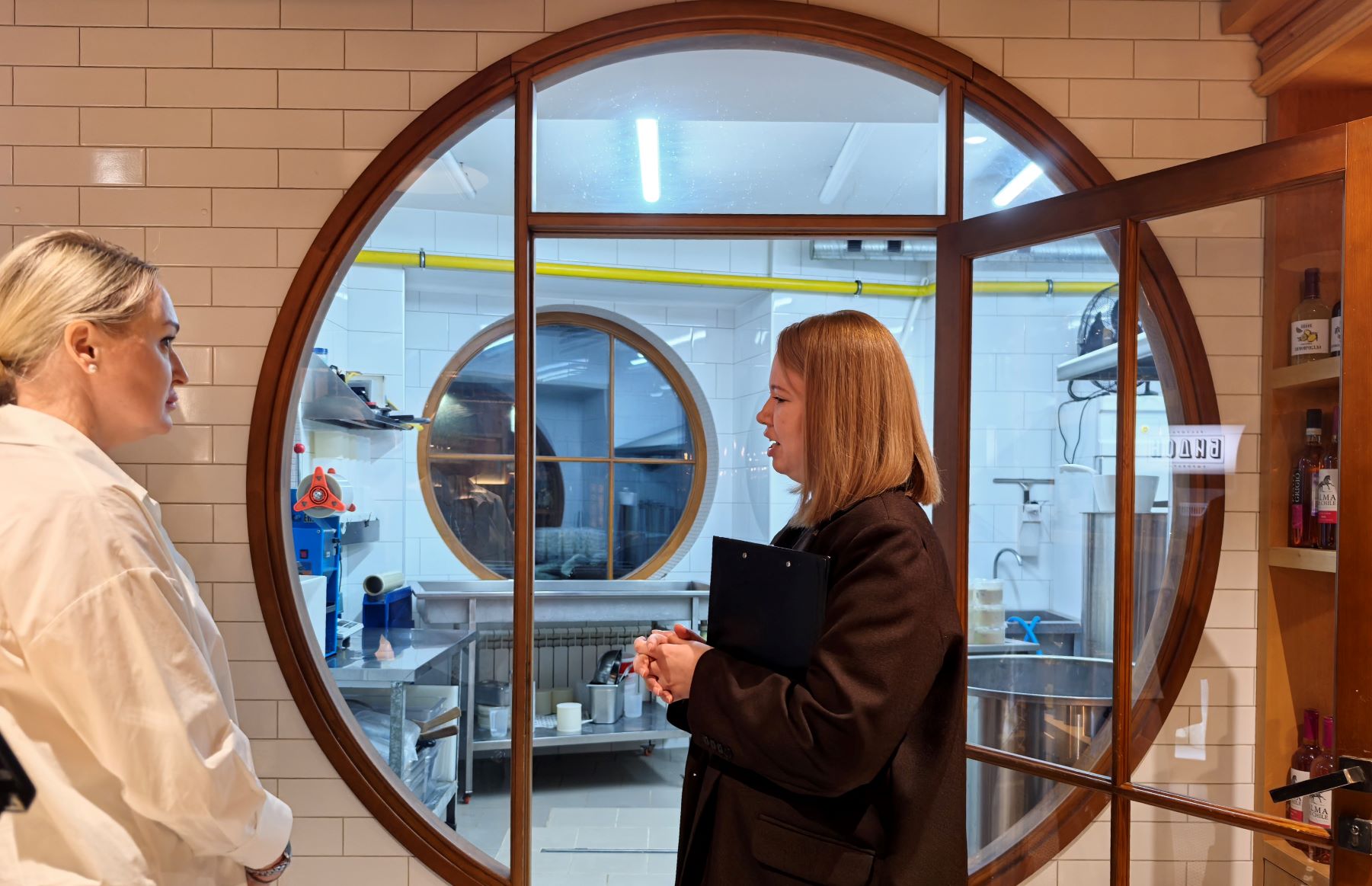 Спустя несколько минут подошли остальные участники, и организаторы познакомили нас с ресторанам, предложив небольшую экскурсию. В прихожей с одной стороны — шкаф для одежды, а с другой — круглое обрамлённое деревом окно. Оно и стало причиной появления в Белгороде сырного ресторана.