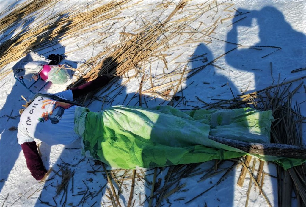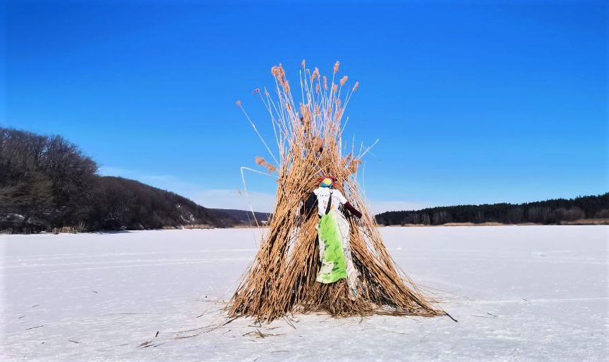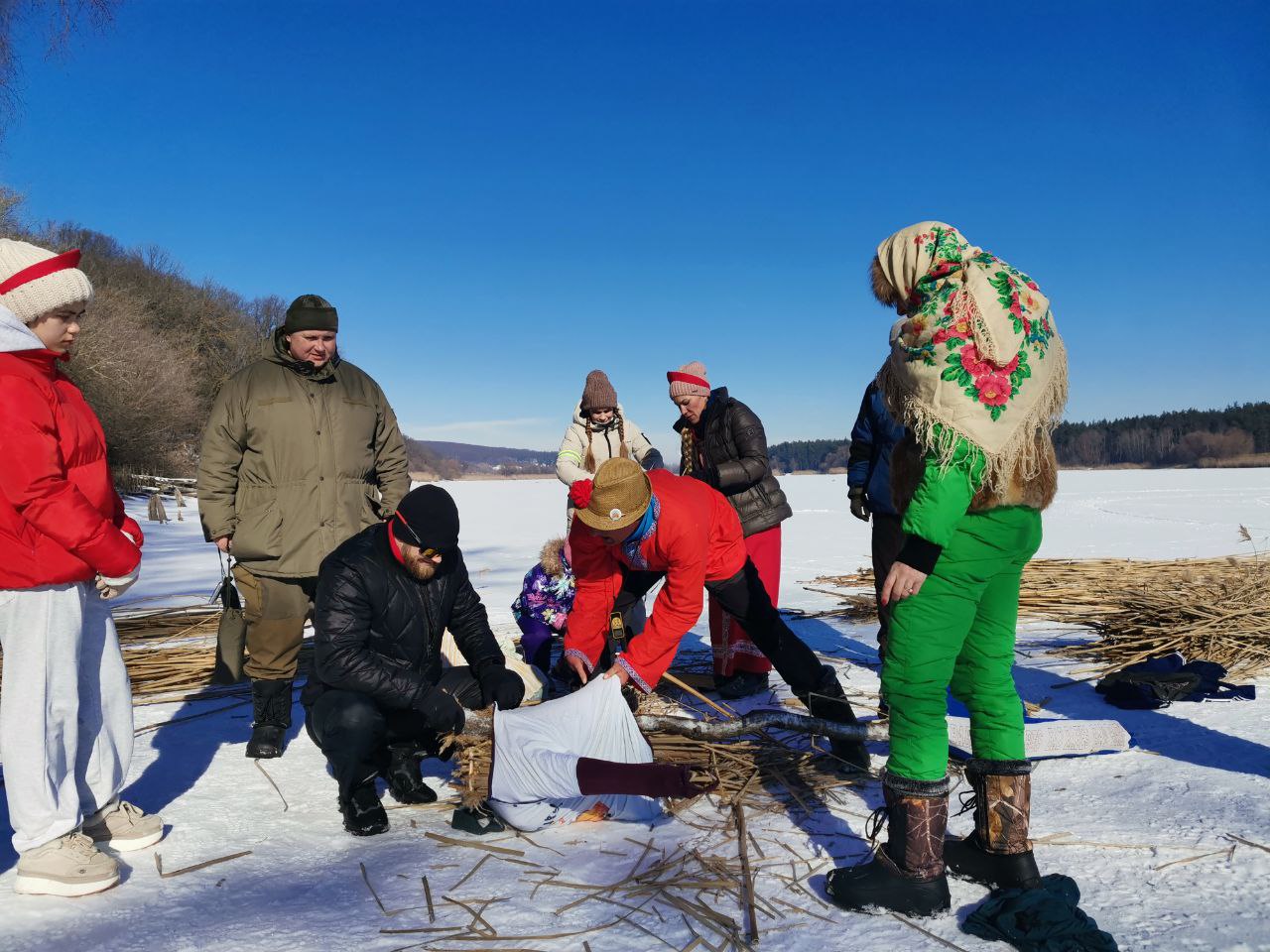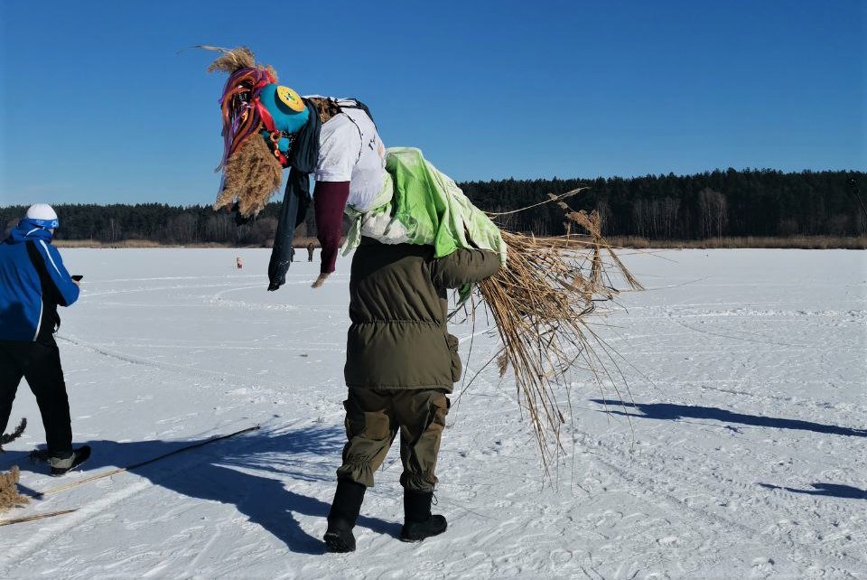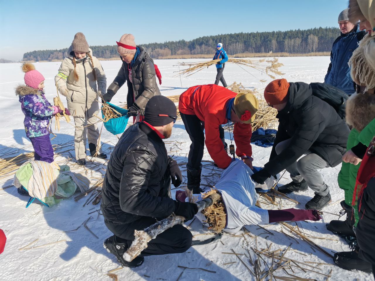 Изготовить соломенную женщину оказалось несложно. Дружно взялись за дело, принесли камыша, нафаршировали модные футболки и штаны, придав нужные формы там, где это требуется — творческий процесс, в котором каждый почувствовал себя скульптором. Притащили основу. Уж очень не хочется писать, что посадили её на кол, но без этого, масленица так и осталась бы загорать горизонтально. Красивая получилась дама, яркая. Встала она на льду, посреди речного простора, руки раскинула, солнышку улыбается. Такую и поджигать жалко, — это ж вам не чучело, похожее на певца Шамана, жечь, или Лабубу страшнючую. Решили пусть позагорает, а мы её пока эстафетами спортивными поразвлекаем да танцами в сарафанах.