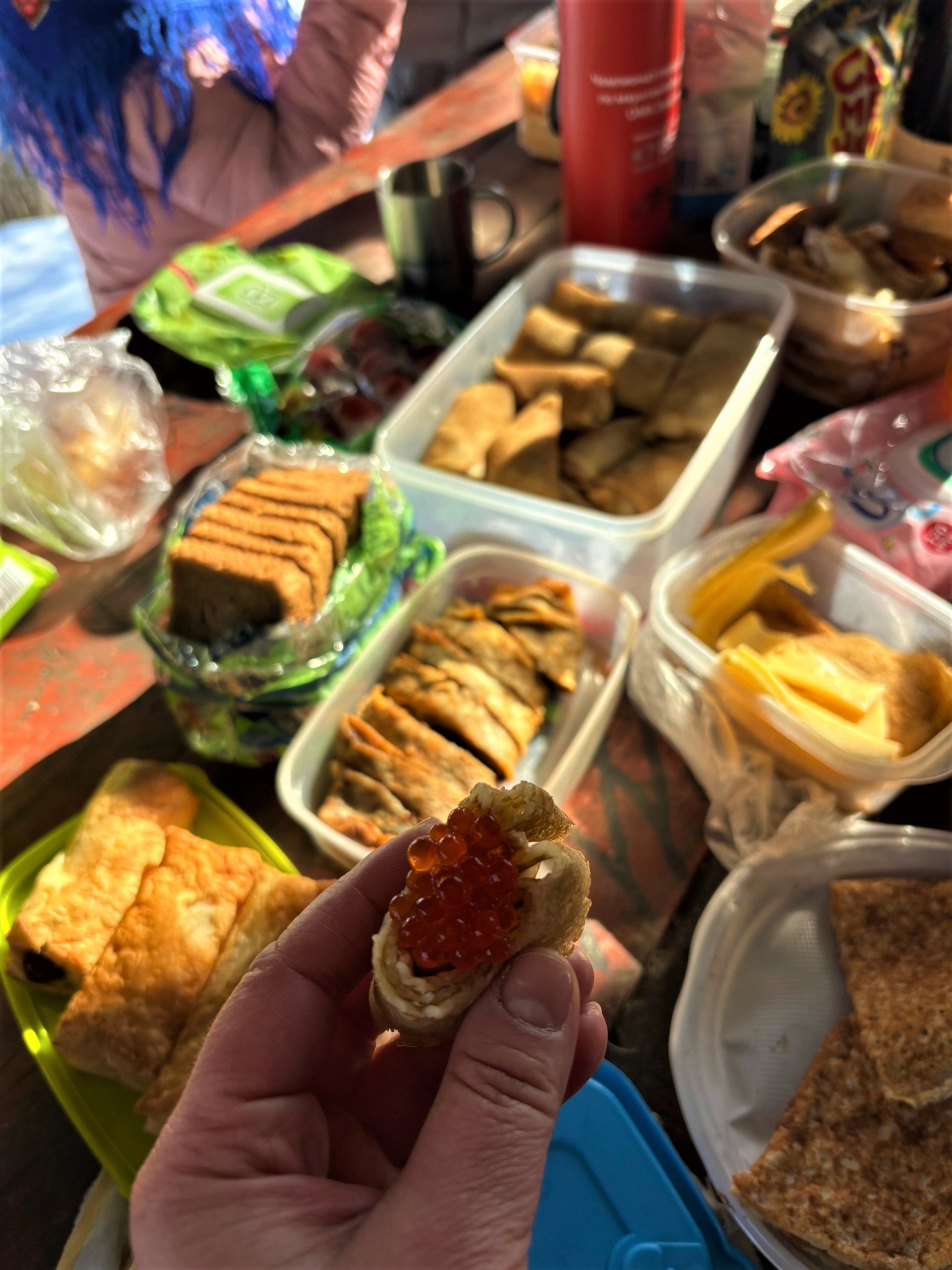 Чтобы прочувствовать настроение Масленицы, нужно взять блины, икру, варенье, не забыть самовар, инструменты для сооружения чучела и модные наряды. Ну и себя любимых украсить наилучшим образом. Настроение праздника создают русские сарафаны, платки, кокошники и косоворотки у парней. Сложив всё это в рюкзаки, можно отправляться в лес, провожать зиму. Так и сделали.