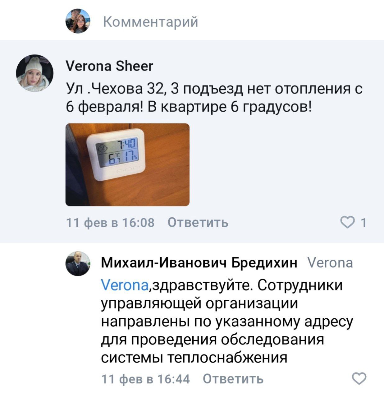 — Уважаемый Вячеслав Владимирович. Ситуация в доме по адресу Чехова, 32 остаётся сложной. Уже почти две недели, с 6 февраля, в доме наблюдаются серьёзные проблемы с отоплением. Сейчас в квартире всего 11 градусов тепла, и люди пытаются согреться всеми возможными способами. Управляющая компания «Жилищный фонд» не может эффективно решить эту проблему. Время от времени к нам приезжают сотрудники, проводят осмотр и уезжают, но тепло в дом так и не возвращается. Кроме того, нам постоянно приходится сталкиваться с грубостью по телефону. Несколько дней назад по данному адресу приезжали вы. Вы отчитались, что ситуация находится на контроле, но на самом деле до сих пор не могут люди согреться. Жильцы дома постоянно жалуются и сообщают о проблеме в различные инстанции. Однако в ответ получают только отговорки о том, что туда были отправлены рабочие и аварийные бригады, но ситуация не улучшается, — написала Анастасия Цыганкова 19 февраля на странице губернатора.
