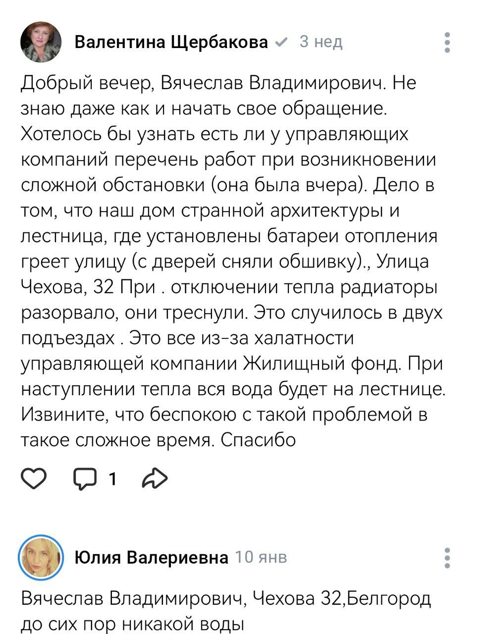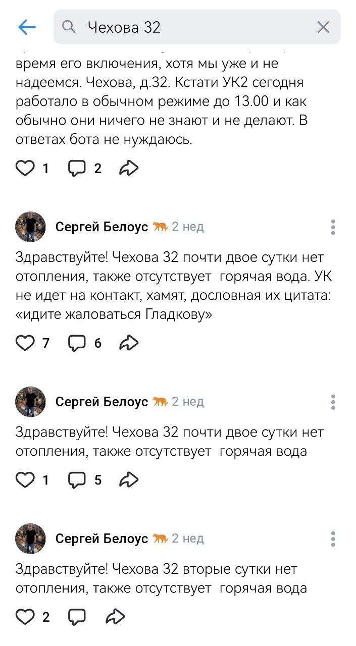 Батареи в квартирах на Чехова, 32, как и во многих других домах Белгорода, остыли после обстрела города ещё 4 февраля. Жители начали свой поход за теплом с управляющей компании «Жилищный фонд». По словам жильцов, на их звонки с жалобами, в УК их в грубой форме направили к губернатору. Жильцы последовали совету. Один из них забросал страницу губернатора в ВК жалобами: «Здравствуйте! Пятые сутки отсутствует отопление и горячая вода на Чехова 32. УК бездействует». Такое сообщение 9 февраля оставил Сергей Белоус. Вскоре к его жалобам добавились и другие.