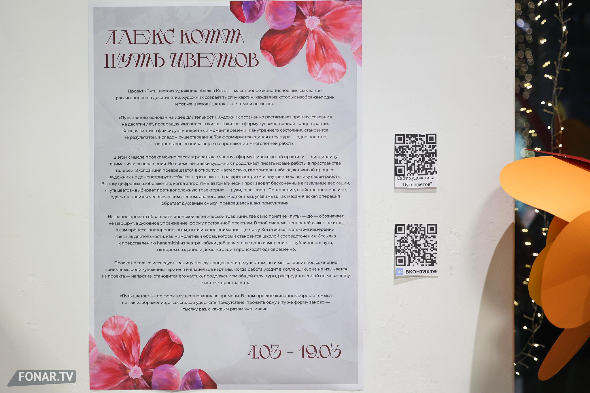 С выставки «Путь цветов» художник Алекс Котт начинает воплощать творческую идею на ближайшие 15 лет — всё это время он намерен каждый день писать картины с одним и тот же цветком. Первые несколько десятков картин представлены на выставке, а всего их будет тысяча. Но каждый раз по-новому — тысяча состояний одного образа, тысяча настроений. Организатор выставки Алёна Алексеева и художник Алекс Котт рассказали, как рождается бесконечная серия, работы из которой уже уехали в частные коллекции США и Германии.