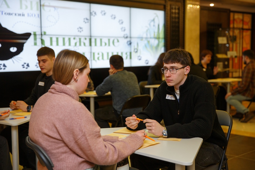 В фойе проводились быстрые «книжные» свидания, на которых участники обсуждали последние прочитанные книги и знакомились друг с другом поближе. Все заранее не знакомы, и как знать, может быть именно книги станут поводом к начать романтические отношения. Кстати, о том, у кого случится «метч» — взаимная симпатия — организаторы обещали позже уведомить лично, проверив все анкеты.