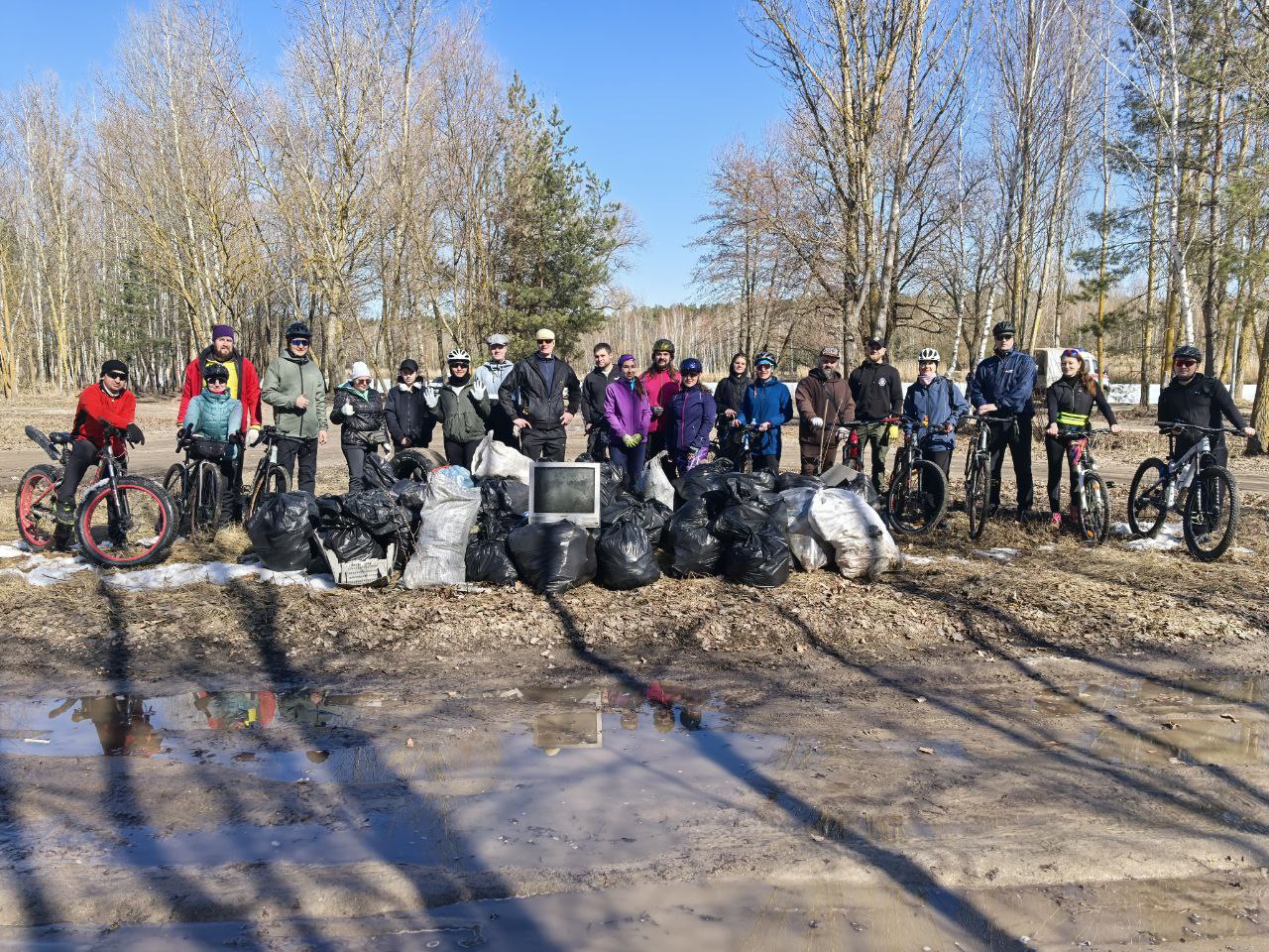 После двух часов уборки велосипедисты собрали все мусорные пакеты в одно место неподалёку от установленного бака — в него бы всё не поместилось. Наталья договорилась с администрацией, и там пообещали прислать машины, которые вывезут мусор. Получилось больше 30 мешков.