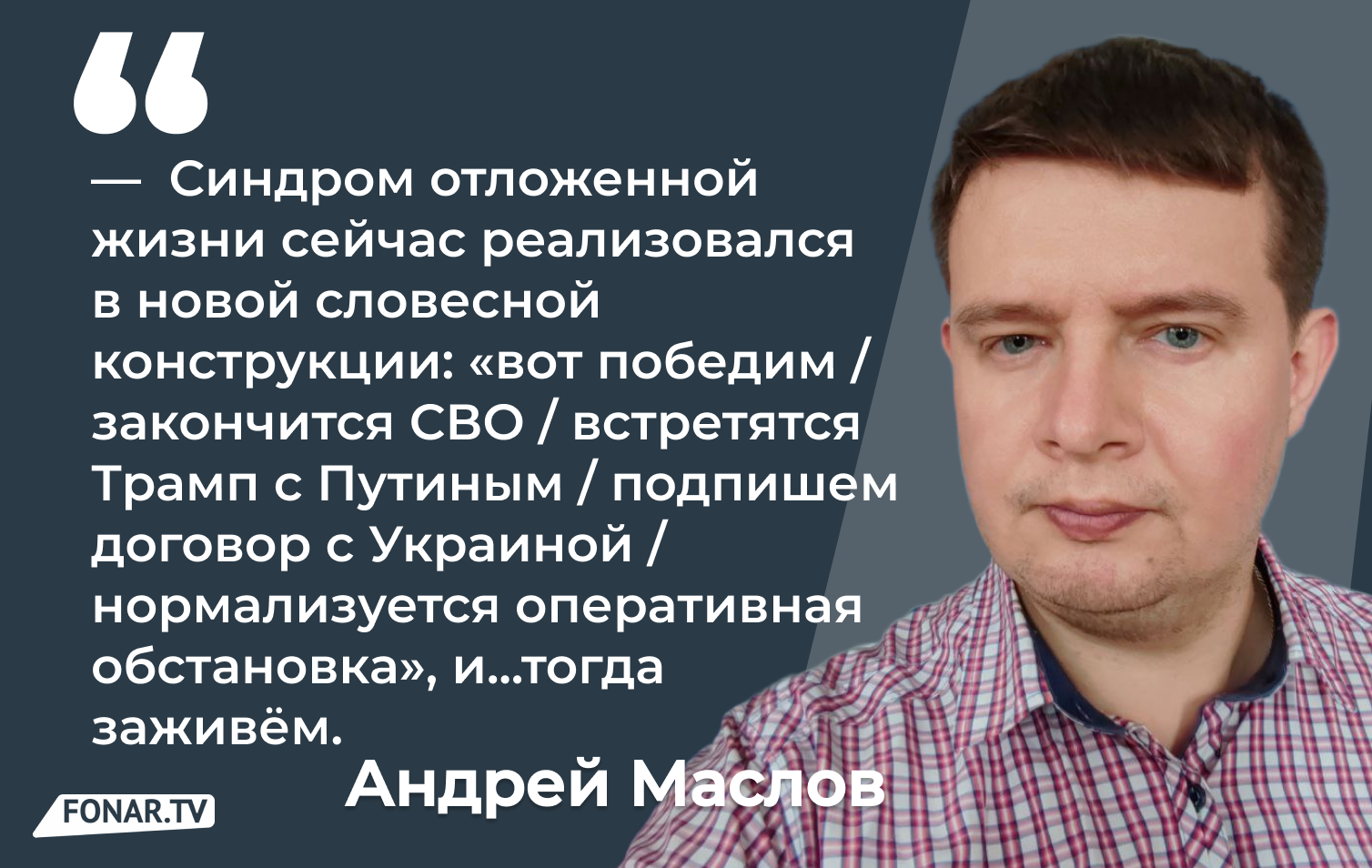 Синдром отложенной жизни сейчас реализовался в новой словесной конструкции: «вот победим / закончится СВО / встретятся Трамп с Путиным / подпишем договор с Украиной / нормализуется оперативная обстановка», и...тогда заживём.