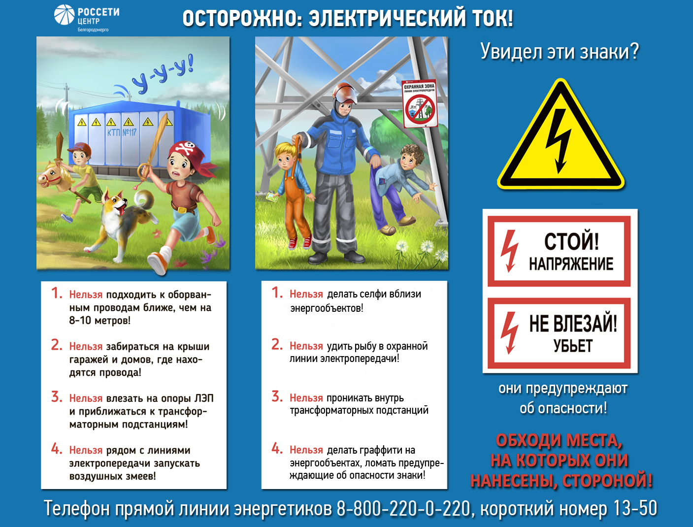 Филиал «Белгородэнерго» напоминает, что согласно статистике, число случаев травматизма среди детей и подростков во время каникул значительно возрастает. Главные причины — баловство и незнание правил электробезопасности. Для этого они ещё раз напоминают свод правил, который советуют объяснить ребёнку, когда вы отпускаете его на прогулку.