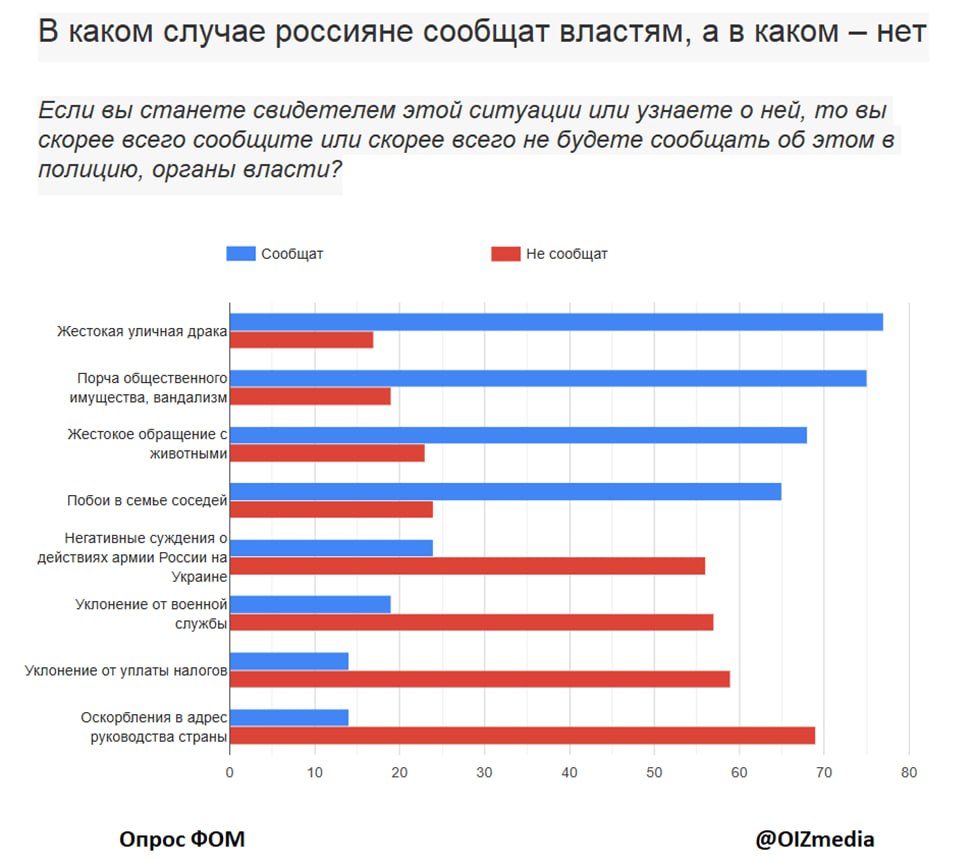 Телеграм-канал «Опросы и замеры» привёл статистику того, о чём россияне сообщат властям, а о чём — нет. В то время как некоторые события вызывают желание обратиться в полицию, другие же наоборот — людьми игнорируются.