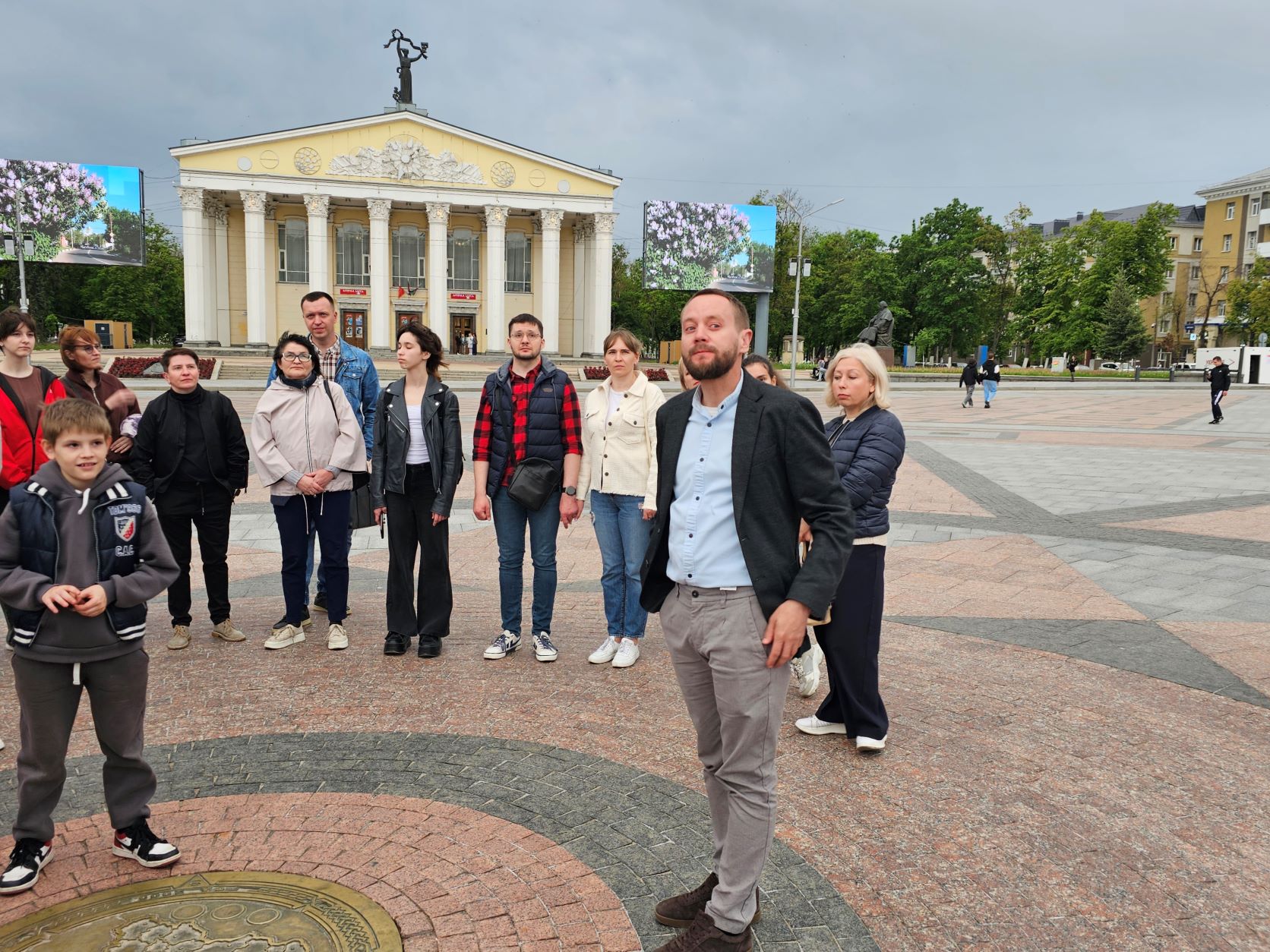 Вместе с Максимом Шапошниковым, участники экскурсии прошли по Гражданскому проспекту от здания областного Минкульта, которое сейчас ремонтируют, до Соборной площади. Шапошников рассказал об исторических зданиях, которые встретились участникам экскурсии на пути к театру — конечной точке маршрута.