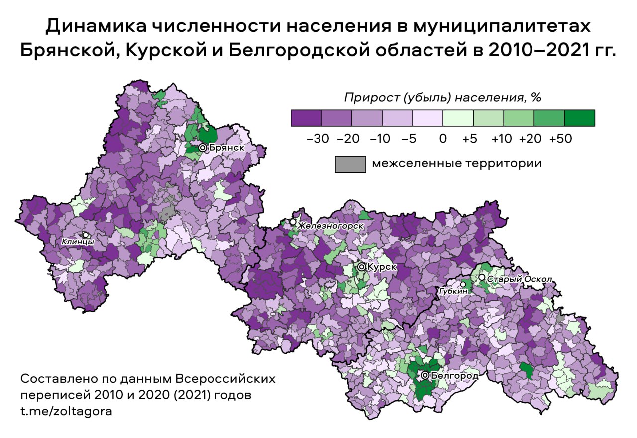 Сельская местность и малые города всех трёх областей продолжают терять население, хотя темпы различаются. В Белгородской области медианная убыль составляет девять процентов, а в Курской и Брянской — 16 процентов. Наиболее проблемные территории расположены на севере и востоке Курской области. Анализ показал, что 17 сельских поселений за этот период потеряли более 40 процентов населения.