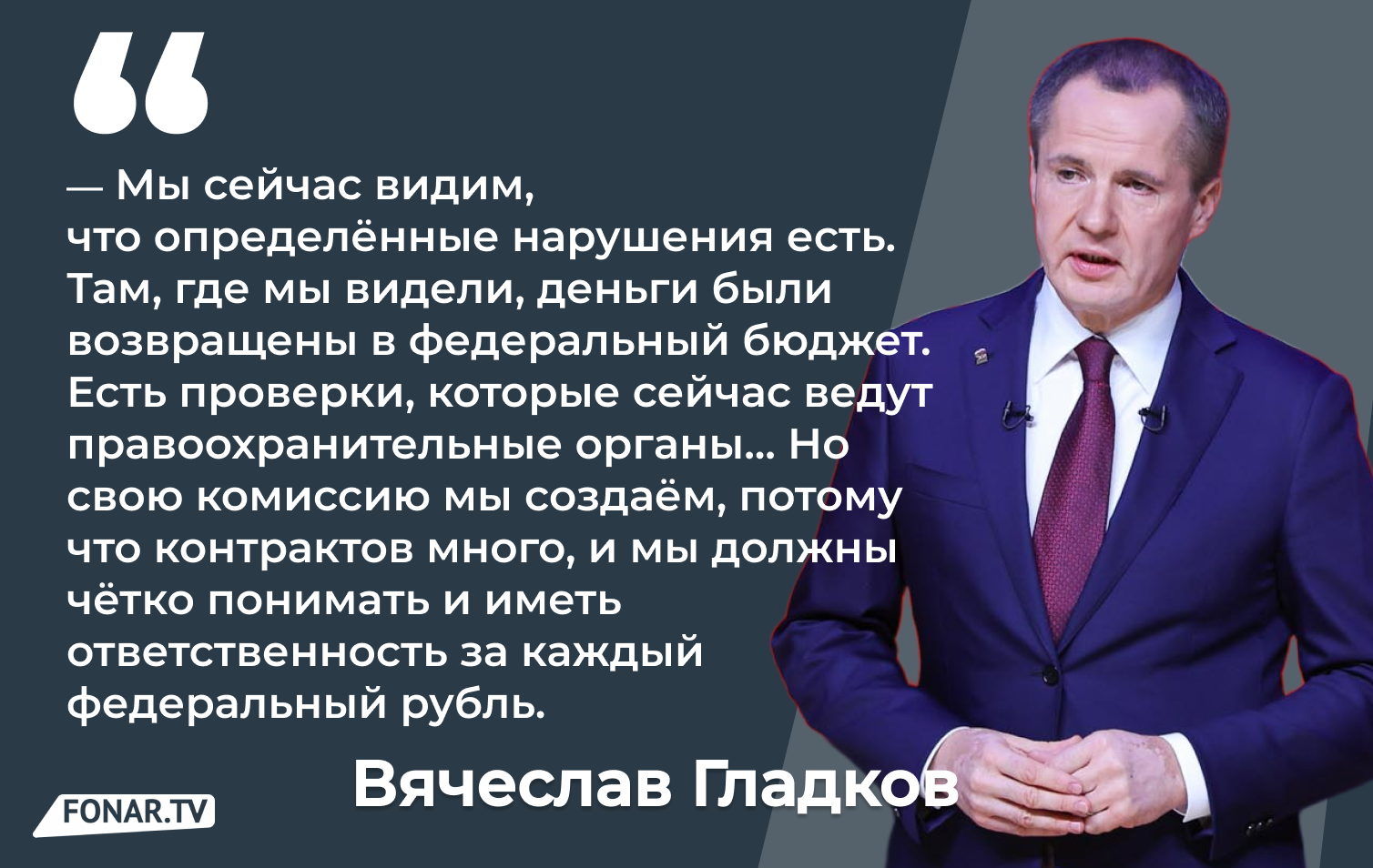 — Мы сейчас видим, что определённые нарушения есть. Там, где мы видели, деньги были возвращены в федеральный бюджет. Есть проверки, которые сейчас ведут правоохранительные органы, и здесь я уже давал такое поручение — максимально отвечать на все вопросы, которые мы получаем со стороны прокуратуры и других правоохранительных органов. Но свою комиссию мы создаём, потому что контрактов, я уже сказал, много, и мы должны чётко понимать и иметь ответственность за каждый федеральный рубль, — подчеркнул губернатор.
