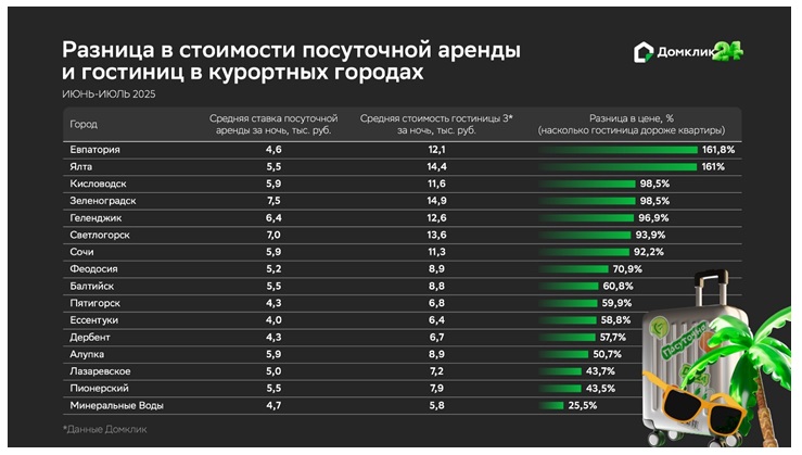 В Евпатории ночь в гостинице обходится в 12,1 тысячи рублей, а аренда квартиры — всего в 4,6 тысячи (разница 162 процента). В Ялте эта разница ещё больше: 14,4 тысячи за отель против 5,5 тысячи за квартиру (161 процент).