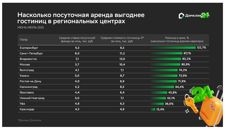 В Екатеринбурге гостиница дороже на 122 процента (9,5 тысячи против 4,3 тысячи. В Москве, Санкт-Петербурге и Владивостоке экономия — более 80 процентов (от 4 до 5 тысяч рублей). В Калининграде разница — 64 процента, а в Краснодаре — всего 13,4 процента (600 рублей).