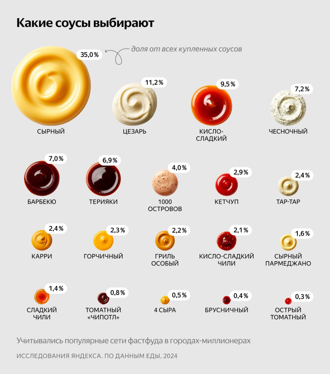 Каждый третий россиянин предпочитает сдабривать своё блюдо сырным соусом: к такому выводу пришли специалисты Яндекса, проанализировав заказы пользователей Яндекс Еды в городах-миллионниках. На втором месте оказался соус Цезарь (11 процентов), а на третьем — кисло-сладкий соус (9,5 процента). Реже всего любители фастфуда выбирают брусничный и острый томатный соусы (0,4 и 0,3 процента соответственно).