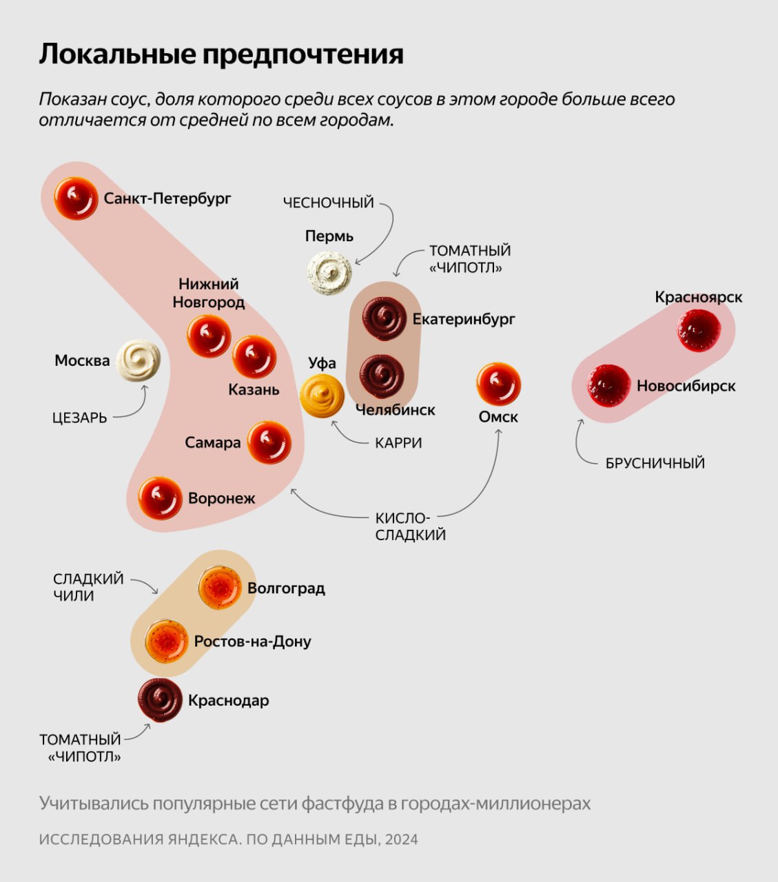 Существуют и региональные вкусовые предпочтения: так, жители Воронежа, Самары, Казани и Нижнего Новгорода с большей вероятностью выберут кисло-сладкий соус, а в Волгограде и Ростове-на Дону отдадут предпочтение сладкому чили. Брусничный соус пользуется популярностью в Новосибирске и Красноярске, а томатный «Чипотл»— в Екатеринбурге и Челябинске.