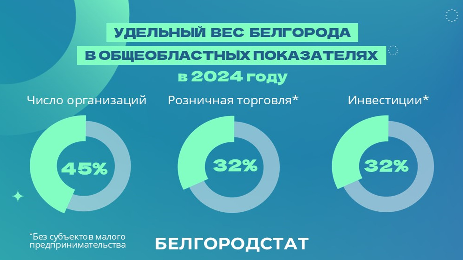 По состоянию на 1 января 2025 года на площади 16 тысяч гектаров в Белгороде проживает 321,8 тысячи человек. Треть территории занимают зелёные зоны: более трёх тысяч гектаров отведено под лесопарки, 442 гектара — под парки, скверы и бульвары. Площадь же застроенных земель составляет почти 10 тысяч гектаров. В городе зарегистрировано 13 тысяч организаций и 12 тысяч индивидуальных предпринимателей.