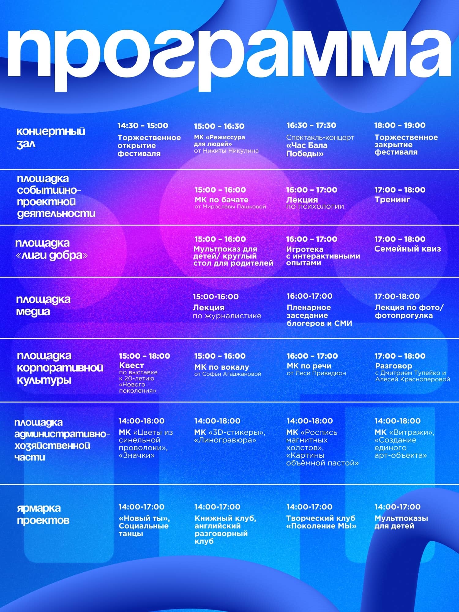 Программа праздника, который начнётся в 14:00 и продлится до 19:00, обещает быть насыщенной. Гостей ждут выступления популярных спикеров, разнообразные образовательные и развлекательные площадки, а также концертная программа. Для творческих людей готовят мастер-классы, которые будут интересны как детям, так и взрослым. Отдельным событием станет пленарное заседание, объединяющее белгородских блогеров и представителей СМИ.