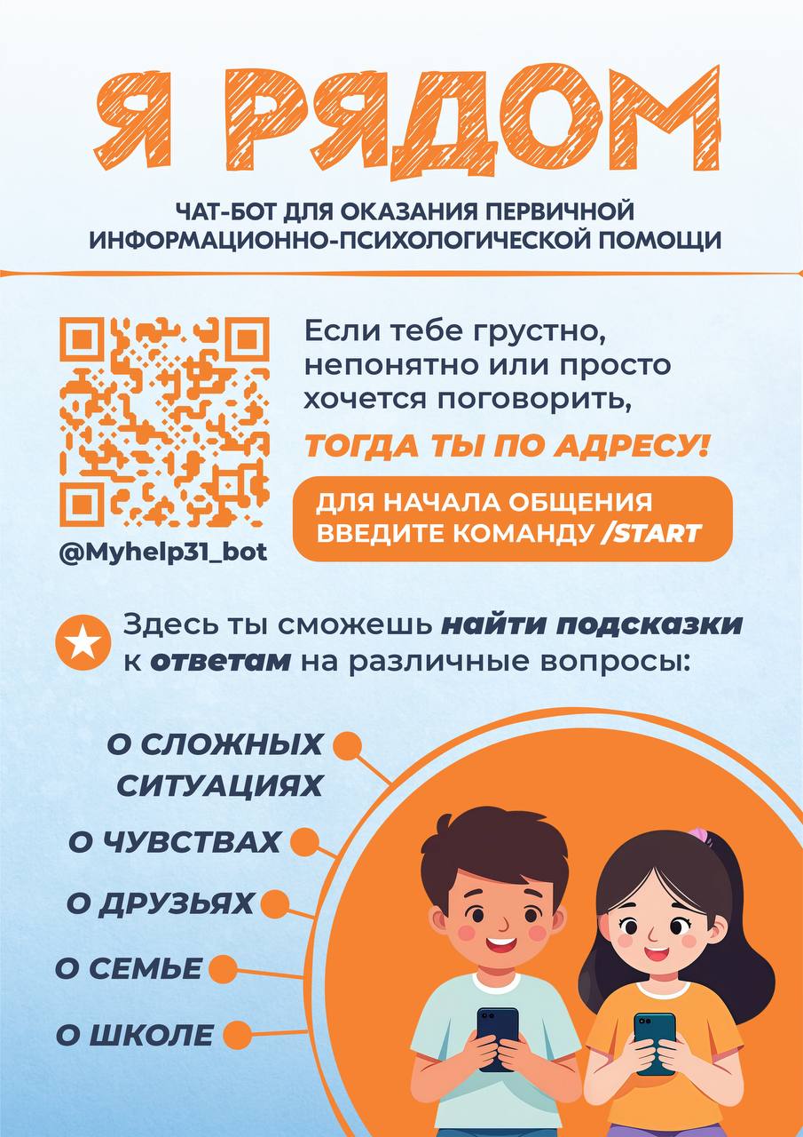 Уполномоченный по правам ребёнка в Белгородской области Галина Пятых представила новый проект — чат-бот «Я рядом». Проект несколько раз обсуждали на заседаниях правительства Белгородской области, его автором стала дублёр губернатора студентка шестого курса Медицинского института НИУ «БелГУ» Елизавета Бахмудова. Целью инициативы является психологическая поддержка подростков в сложных ситуациях, профилактика правонарушений и защита их прав.